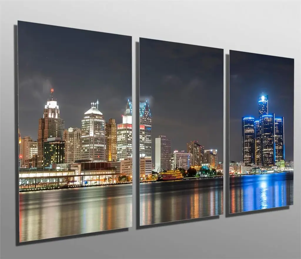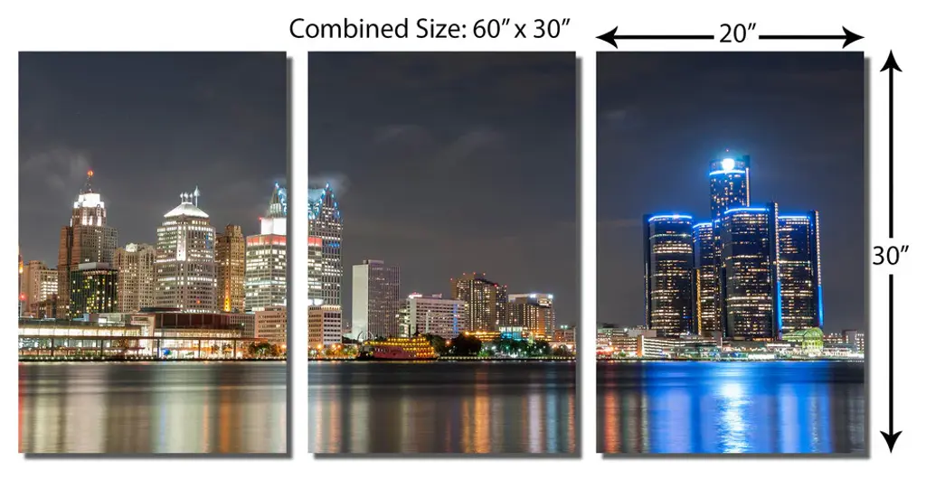 60"œ x 30"œ total size. Ready To Hang! (3 pieces - 20"œ x 30"œ each). 3 Panel Split (Triptych) Metal Print of Detroit, Michigan Skyline at night. Modern metal wall art for home or office wall decor & interior design. Printed on Luxurious, HD aluminum glossy metal panels. Multi panel art.. HD aluminum panels. Metal print wall art. Includes Shadow Wall Mount on the back.• Aluminum Metal Wall Art• Made in USA• Ready to hang - No assembly required• Shadow mount hardware on the back• 0.045"œ thick HD Aluminum Panels• Scratch resistant, glossy finish• Superb color clarity, luxurious prints• Epson printing process• For indoor or moisture rich environment use• Easy to clean. Gently wipe with microfiber cloth.