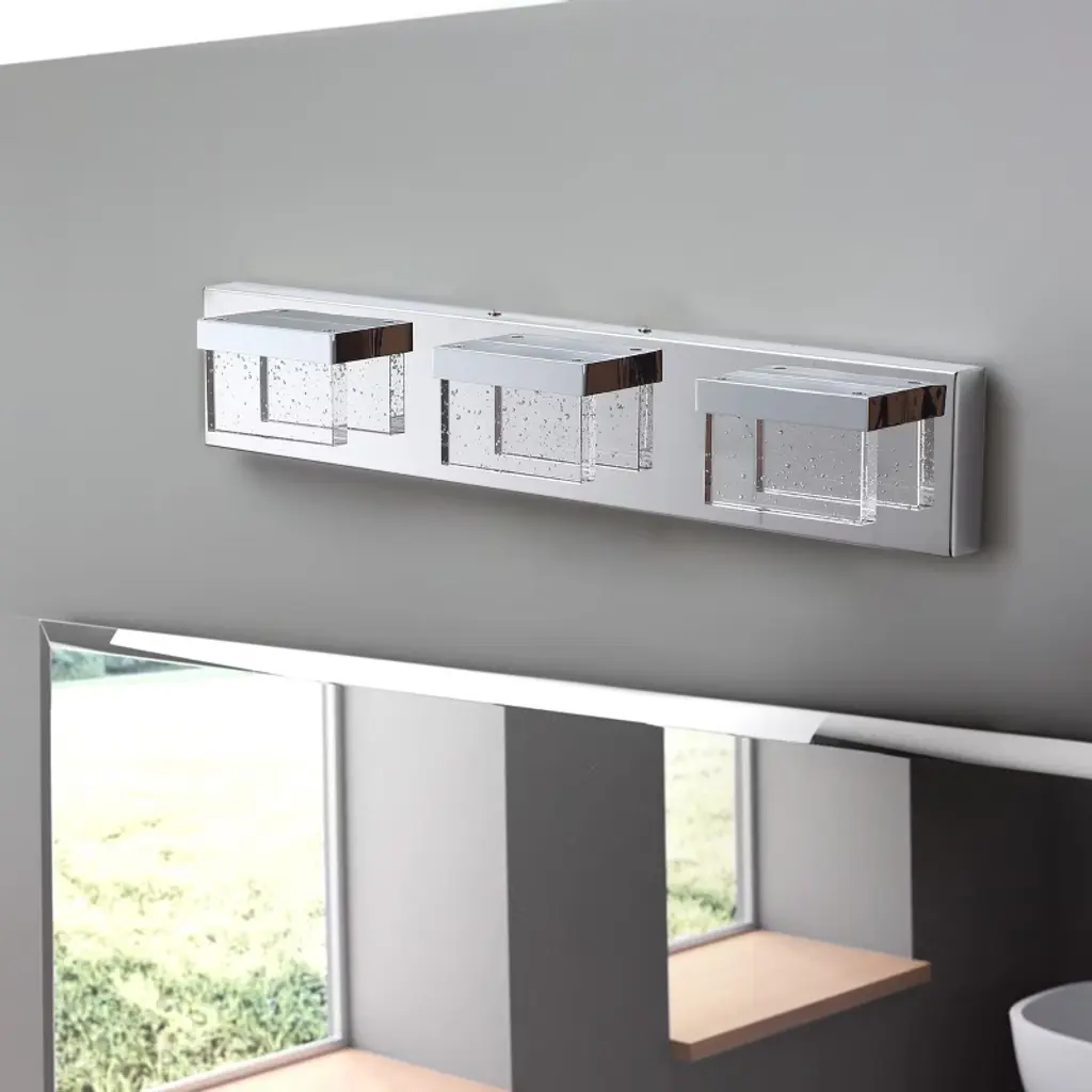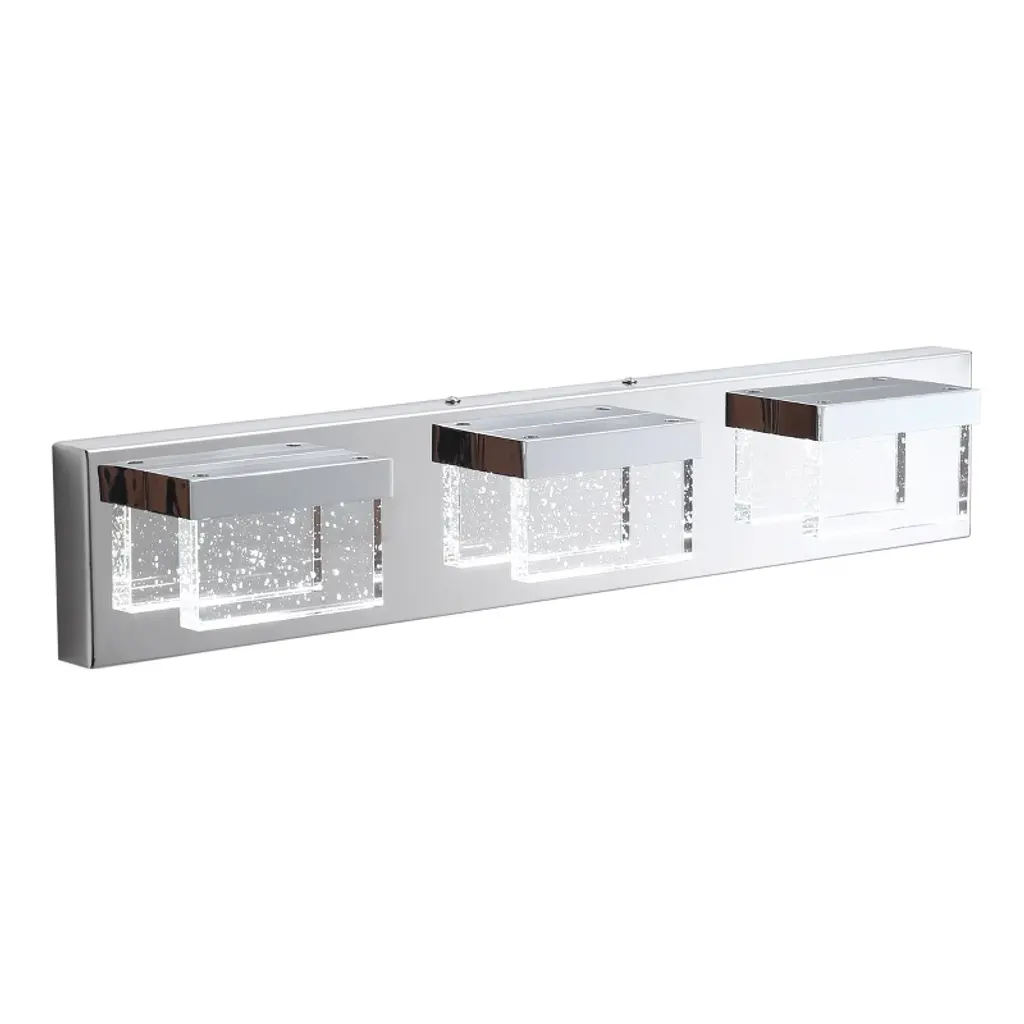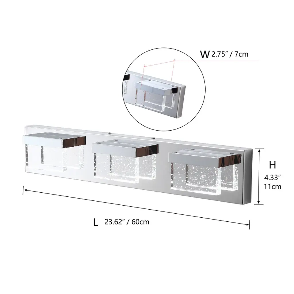 Specifications: Type: Modern Vanity Light Materials: Metal, Glass Finish: Painted Color: Chrome Number of Lights: 3 Lights (bulbs not included)Direction: Multi-directional Base: LED IntegratedWattage: 15W Voltage: 110V Dimensions: 2.75 in. W x 23.62 in. D x 4.33 in. HFeatures: Modern Modern style: The modern square vanity light meets all the needs of different spaces, adding an impressive look while complementing the decor of your home. Quality Assurance: High-quality metal and glass craft with painted finish. All products in the factory have to undergo rigorous safety monitoring, to ensure quality and safety. Easy to Install: There is no need to worry about the installation difficulty, to achieve installation quickly, all installation hardware and installation instructions are included in the package for you. Variety of Choices: Provide the most abundant categories of lighting products, to meet your needs. Our main products include LED Chandeliers, Pendant lights, Flush mount lights, Crystal Ceiling lamps, and island lights. Scope of Application: Provide lighting or decoration for any space. Can be widely used in bathrooms, hallways, living rooms, bedrooms, kitchens, etc.