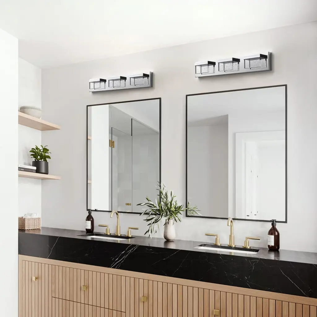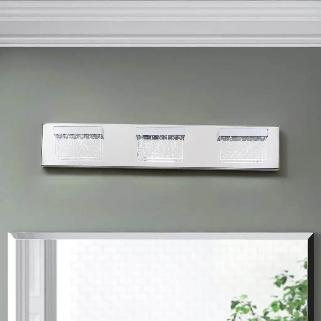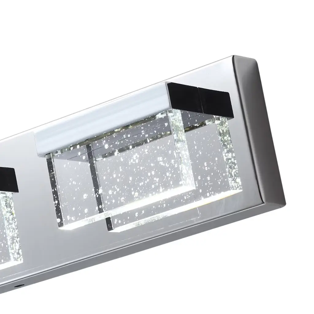 Specifications: Type: Modern Vanity Light Materials: Metal, Glass Finish: Painted Color: Chrome Number of Lights: 3 Lights (bulbs not included)Direction: Multi-directional Base: LED IntegratedWattage: 15W Voltage: 110V Dimensions: 2.75 in. W x 23.62 in. D x 4.33 in. HFeatures: Modern Modern style: The modern square vanity light meets all the needs of different spaces, adding an impressive look while complementing the decor of your home. Quality Assurance: High-quality metal and glass craft with painted finish. All products in the factory have to undergo rigorous safety monitoring, to ensure quality and safety. Easy to Install: There is no need to worry about the installation difficulty, to achieve installation quickly, all installation hardware and installation instructions are included in the package for you. Variety of Choices: Provide the most abundant categories of lighting products, to meet your needs. Our main products include LED Chandeliers, Pendant lights, Flush mount lights, Crystal Ceiling lamps, and island lights. Scope of Application: Provide lighting or decoration for any space. Can be widely used in bathrooms, hallways, living rooms, bedrooms, kitchens, etc.