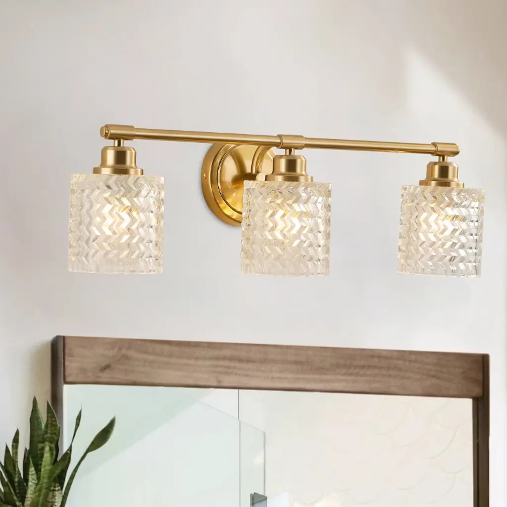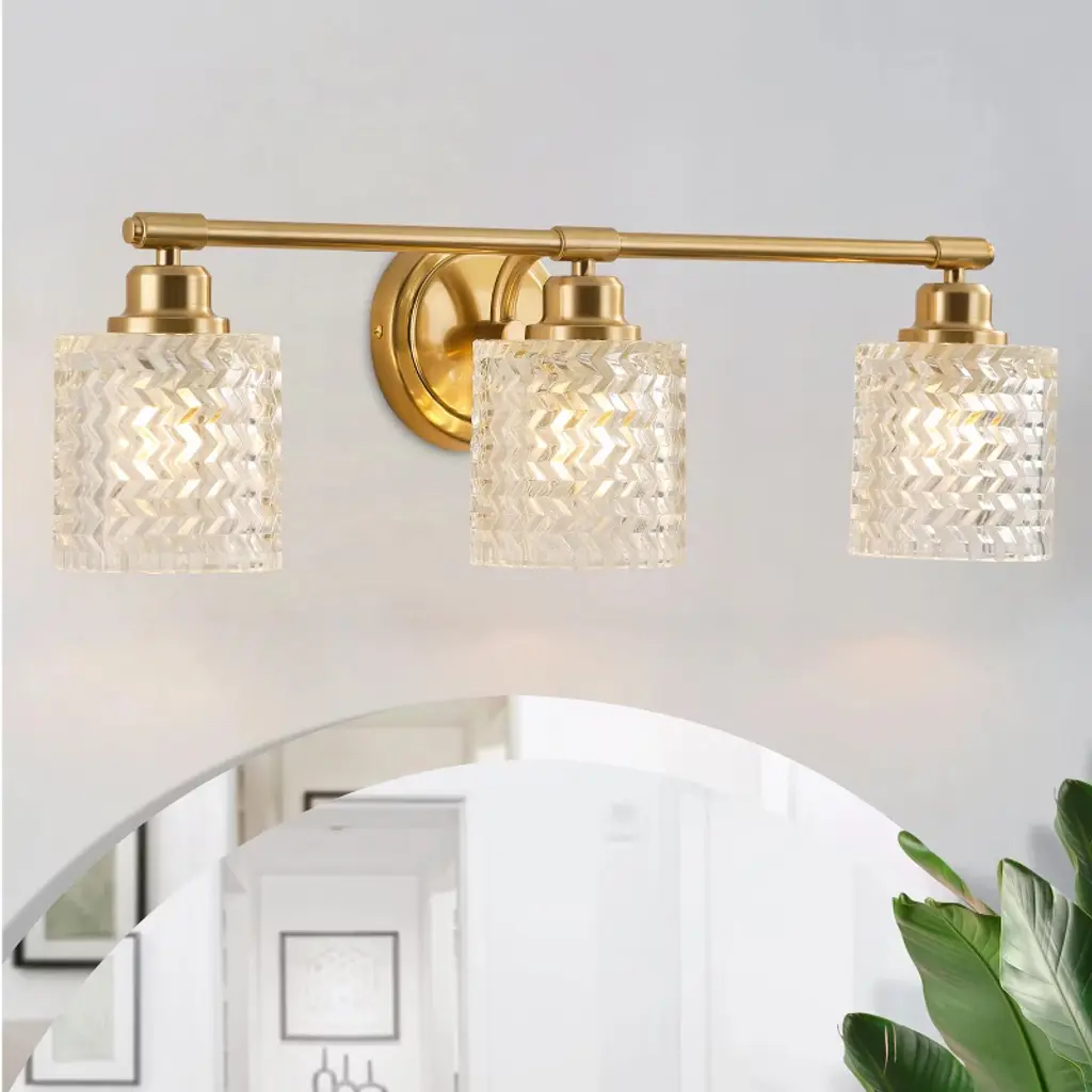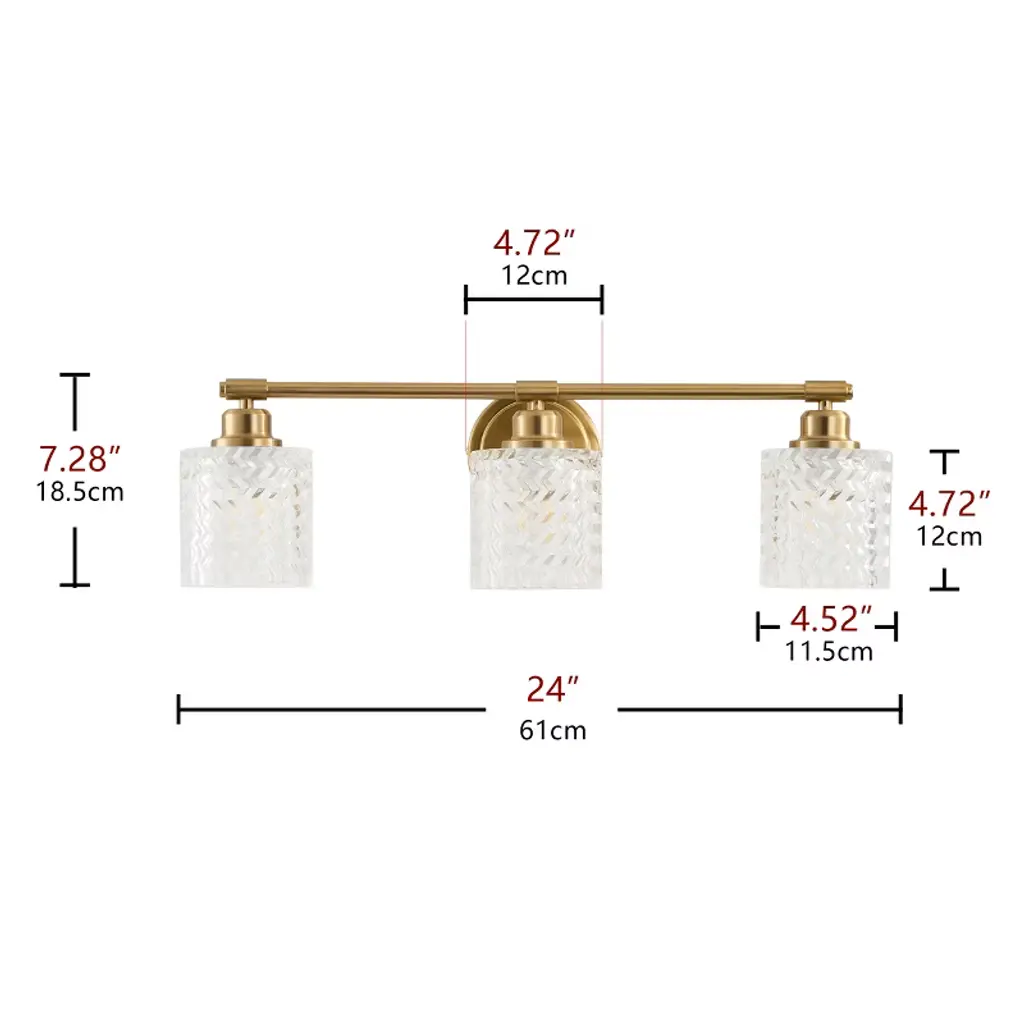 Specifications: Type: Modern Vanity LightMaterials: Iron, GlassFinish: PaintedColor: GoldVoltage: 120VMax Wattage: 40WBulb Base: E26/Medium (Standard) Dimensions: 4.52 in. W x 24 in. D x 7.28 in. HNumber of Lights: 3 Lights (bulbs not included) Modern Design: This bathroom light fixture has a gold finish structure and three textured glass shades for a stylish design that adds elegance to your home. The light bulbs could be encased in unique glass shades and emit an elegant, soft light ambiance. Quality Assurance: High-quality iron and glass were used to craft the vanity light. All products in the factory have to undergo rigorous safety monitoring to ensure quality and safety, which is beautiful, corrosion-resistant, and durable for a long time. Easy to Install: All the necessary accessories are included in the package of this bathroom vanity light fixture, and there are detailed installation instructions to help you get ready for quick installation and complete installation in just a few minutes. ETL Listed & Bulb Requirement: ETL Listed for your safety. The modern vanity light is a built-in standard E26 socket, so we suggest using a dimmable E26*3 base bulb (Max 40W, 120V). it could be a fully dimmable and compatible dimmer switch. Bulbs and a dimmer switch are not included. Fits Any Spaces: The vanity light with clear glass shades combines the modern and industrial styles to ensure a popular decoration for your home, such as bathrooms, bedrooms, corridors, kitchens, hallways, foyers, diningroomsm, and so on.