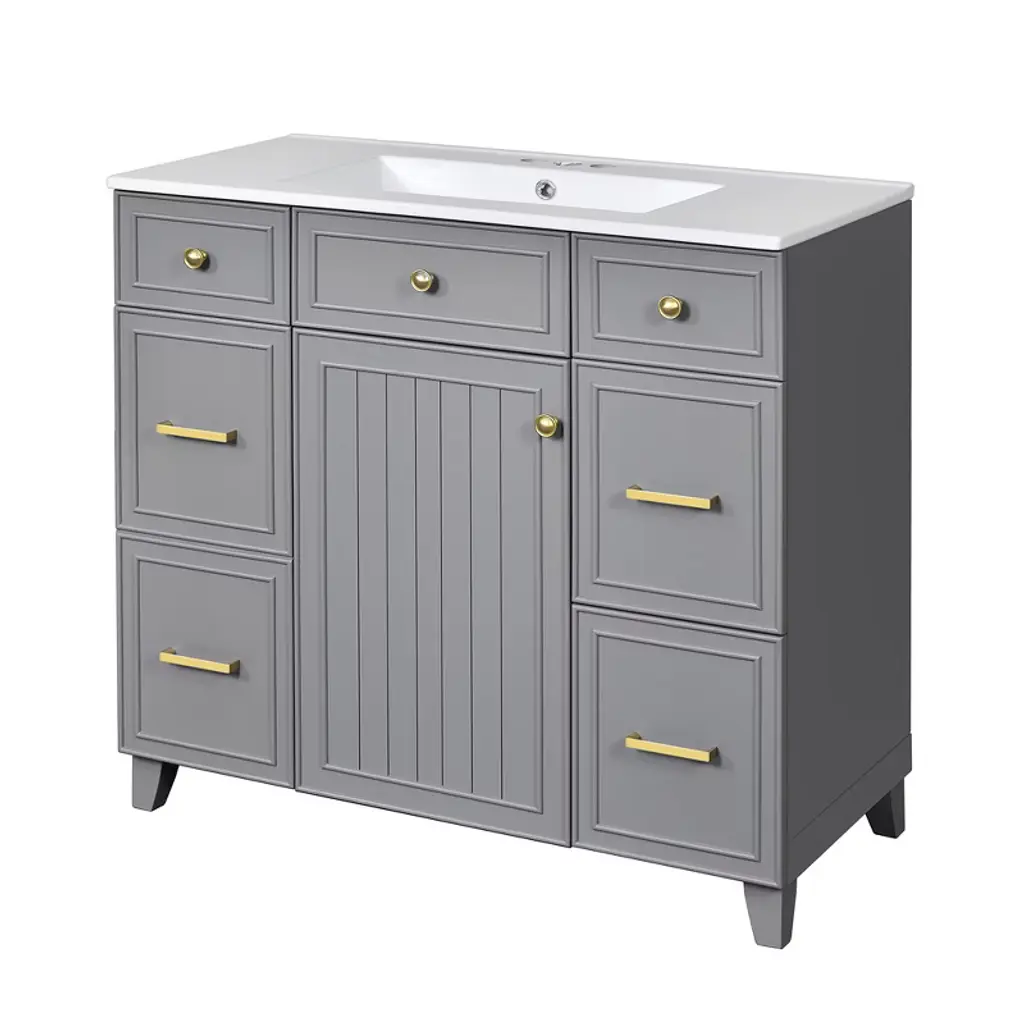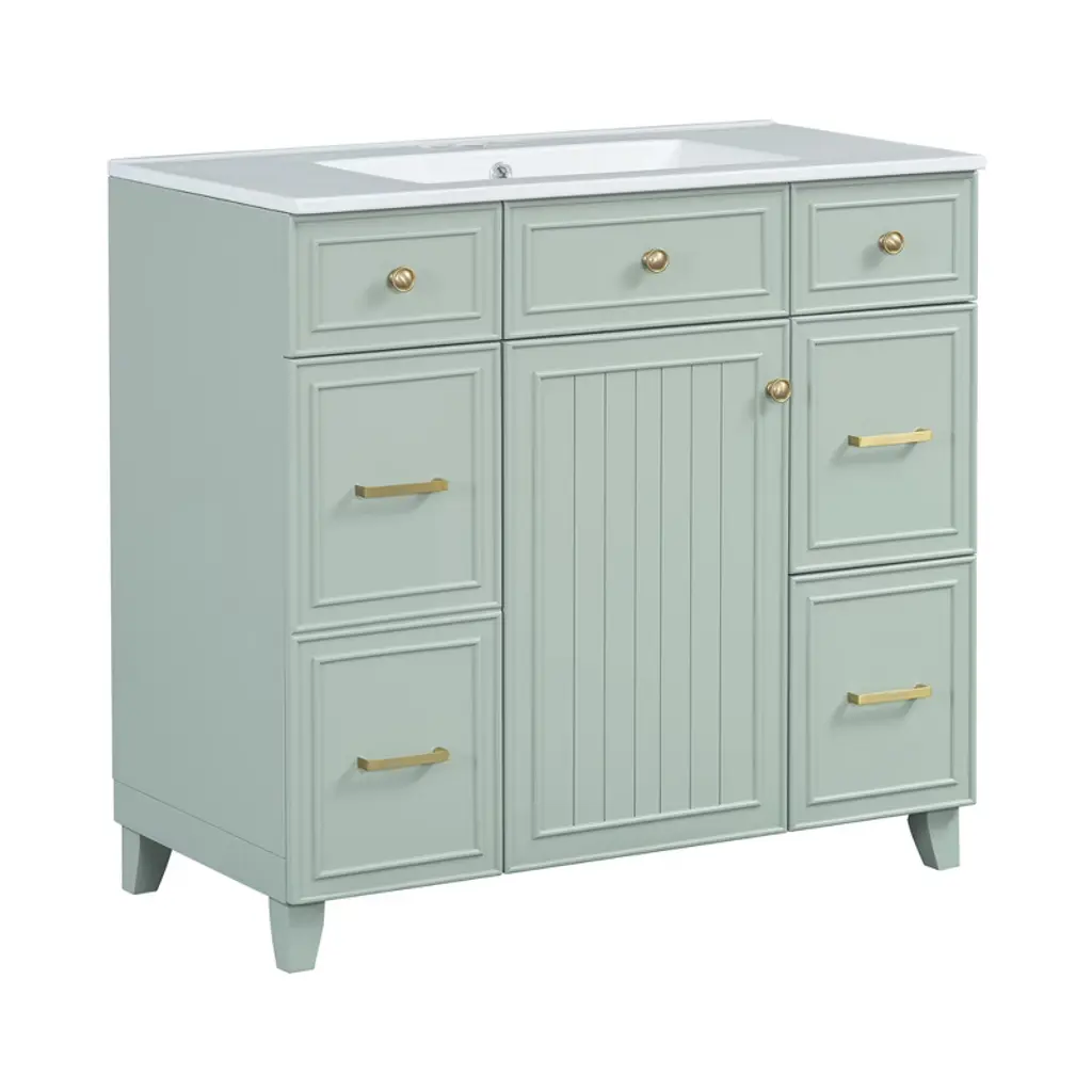 Stylish 36" Bathroom Vanity: This 36" bathroom vanity is suitable for bathroom in any decoration style. Freestanding green vanity cabinet with silver handles complies with your bathroom facilities. The groove design on the door and drawer increases the artistry and aesthetics of the home environment. If you're looking for a simple but stylish bathroom sink vanity, our product will be a great choice to upgrade your bathroom. Smooth Ceramic Sink: Our bathroom basin sink is made of solid ceramic with smooth and water-proof finish, which hardly leaves water stains. The pre-drilled three holes on the top is available to 4" centerset faucet (not included). Besides, the overflow with metal circle is in case of water spilling over when you forgot to turn off the tap. Solid Wood Material & MDF Board: Practicality and durability are important to bathroom facilities, so we used real rubber wood as the structure of this bathroom vanity and MDF boards for the other parts, which not only increases the product stability but also ensures a long-lasting use. Furthermore, the surface of this vanity cabinet is finished with eco-friendly painting. It is water-proof, stain proof and very easy to clean.