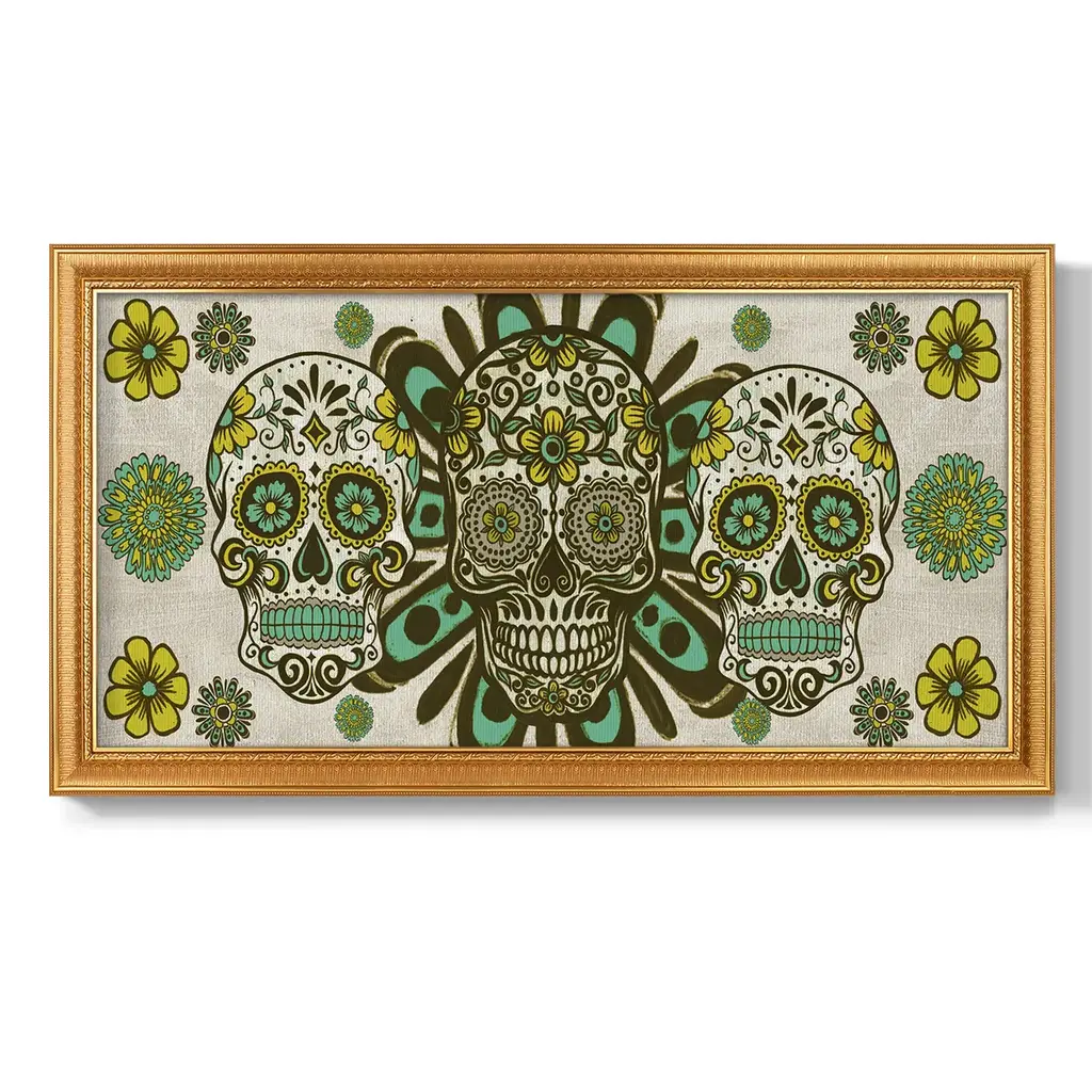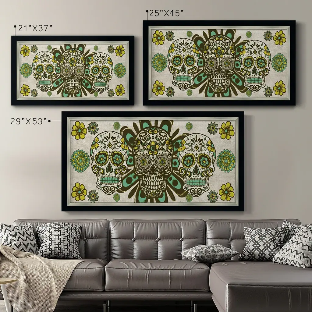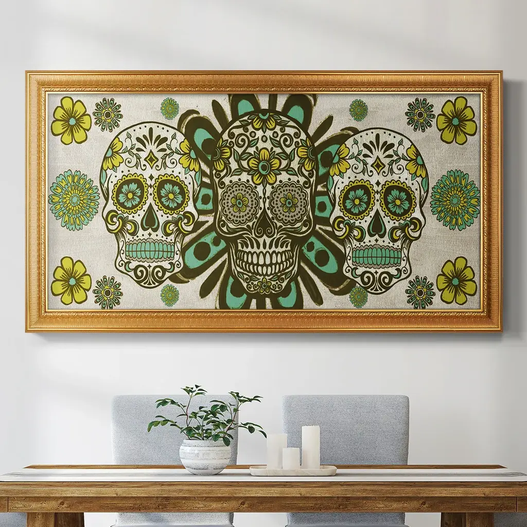 Dia de los Muertos Collection D Premium Framed Canvas- Ready to Hang A Premium Framed Canvas created to last. Framed in distressed wood and available in an array of sizes and colors Featuring a beveled a solid wood stretcher bar, each piece comes ready to hand 3 SIZES AVAILABLE 21''X37'' - Overall Size 25''X45'' - Overall Size 29''x53'' - Overall Size Each piece is made to order. Each piece comes with hanging hardware. Made in the USA Ready to Hang Giclee Paper Print Acrylic Glass Beveled Matt Board