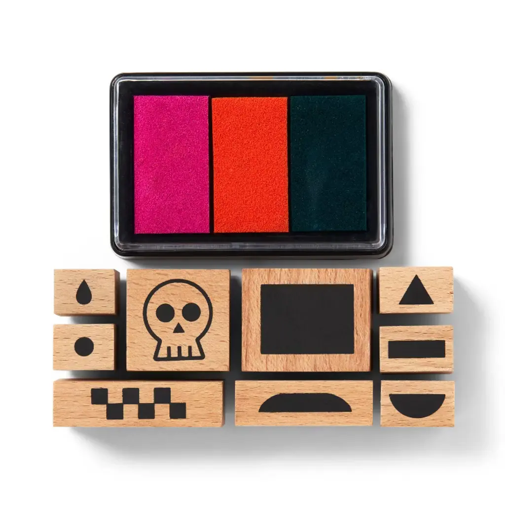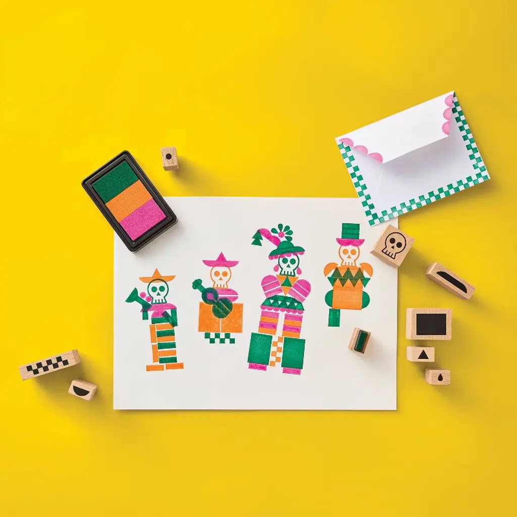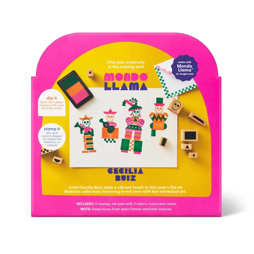 Kids will love to showcase their own imaginative designs for celebrating Día de Muertos with this Create-Your-Own Stamp Calaca Kit from Mondo Llama™. This kit includes nine rubber stamps with mix-and-match shapes to design fun, festive calaca characters. Just dip the stamp on the tri-color inkpad and stamp away on paper, cards and more to create vibrant designs. Once finished, they can display their beautiful artwork on the ofrenda or share with family and friends.Mondo Llama™: Find your creativity in the making.
