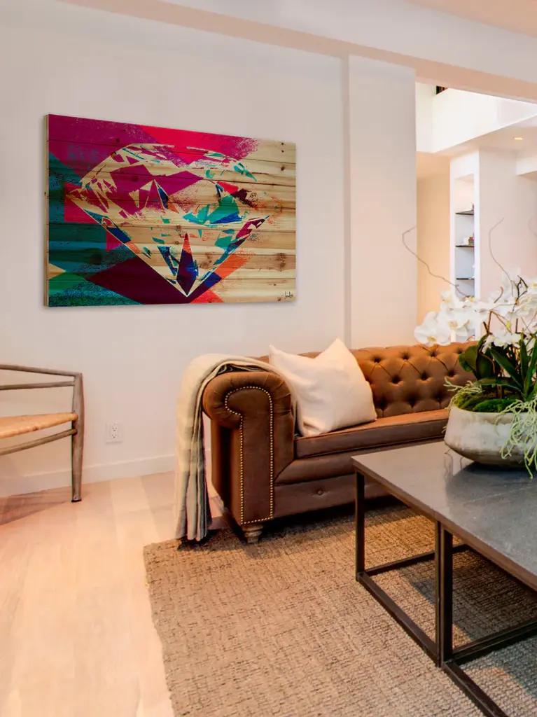 The 45-by-30-centimetre "Diamond in the Rough" Print on Wood by Jen Lee is a brightly coloured work of Pop Art. Rich shades of blue, magenta, red and green illuminate the sharp angles of the central diamond. By printing this work with UV inks on pieces of pine board, the artist echoes the title theme of the composition. Spearheaded by Parvez Taj, Marmont Hill is a collective of artists whose original, limited edition creations are handcrafted with love and care. Frame included: NoUV ink print on hand-selected pine woodArrives ready to hangCertificate of authenticity includedArtist signature on image