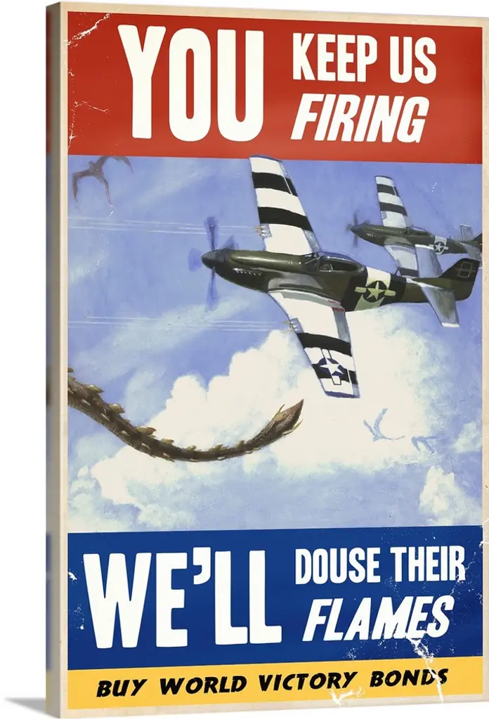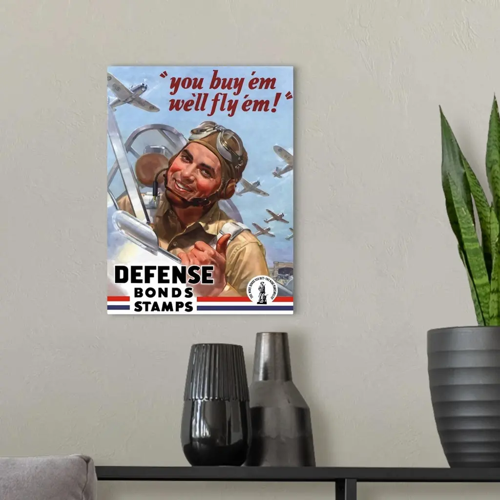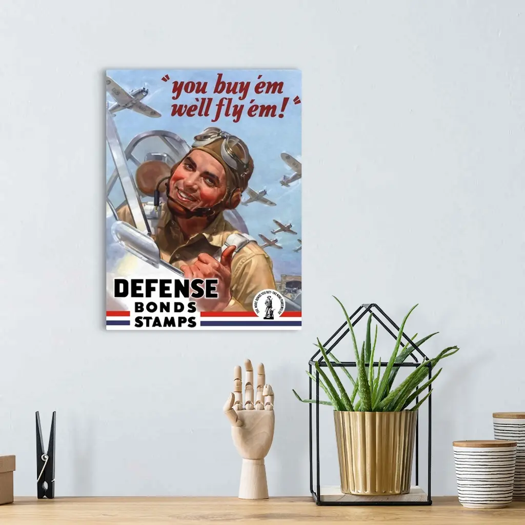 Digitally restored vector war propaganda poster. This vintage World War Two poster features an American fighter pilot, giving the thumbs up from his plane, in a plane filled sky. It declares - You Buy 'em, We'll Fly 'em -- Defense Bond Stamps.