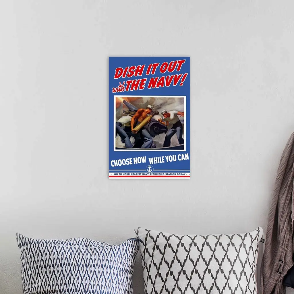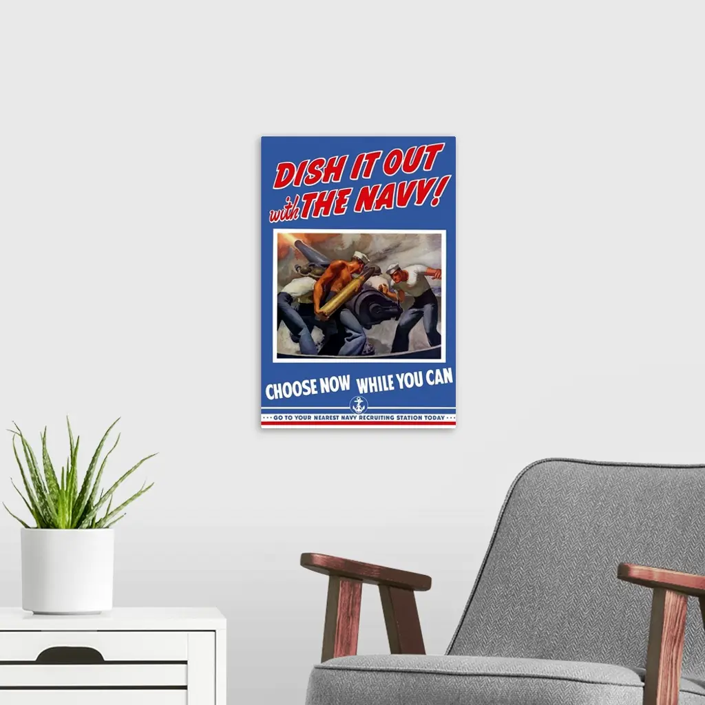 Digitally restored vector war propaganda poster. This vintage Navy World War Two poster features three American Sailors loading the gun of a battleship. It declares - Dish It Out With The Navy, Choose Now While You Can, Go To Your Nearest Navy Recruiting Station Today.