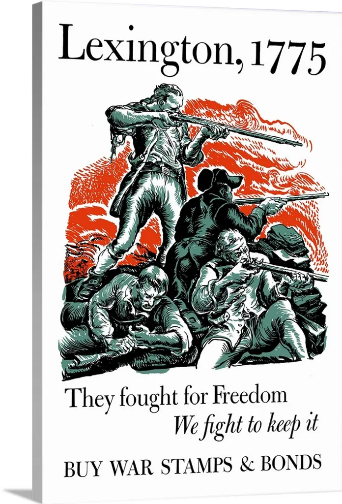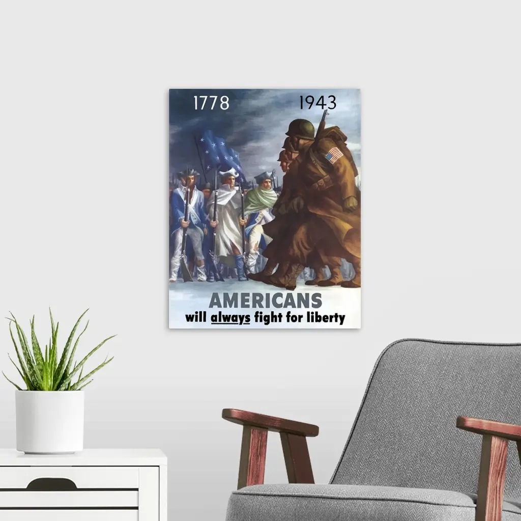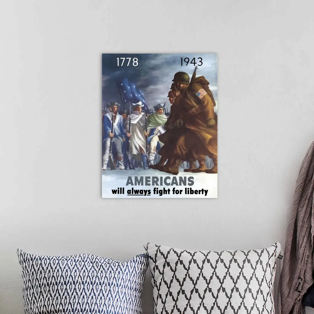 This vintage war poster features American Infantryman marching past Minutemen from the Revolutionary War. The top features the dates 1778 and 1943, and the bottom declares - Americans Will Always Fight For Liberty.