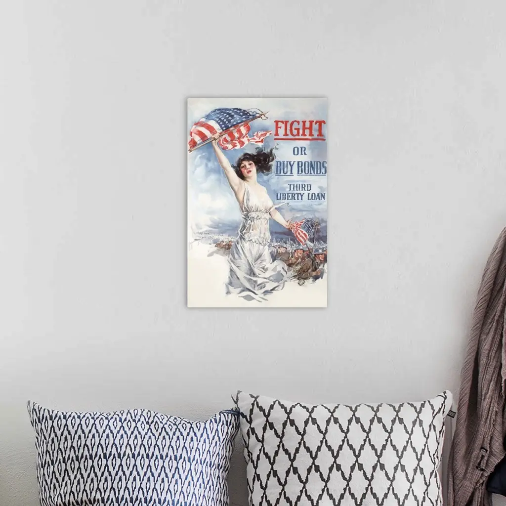 Digitally restored vector war propaganda poster. This vintage World War 1 poster features Lady Liberty waving the American flag. Behind her, American troops are rushing into battle. It declares - Fight or Buy Bonds, Third Liberty Loan.