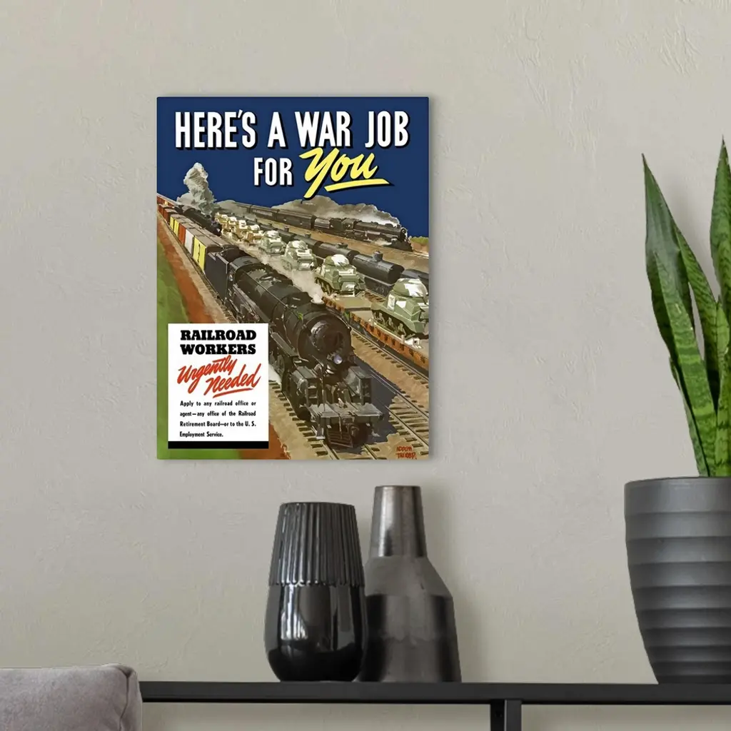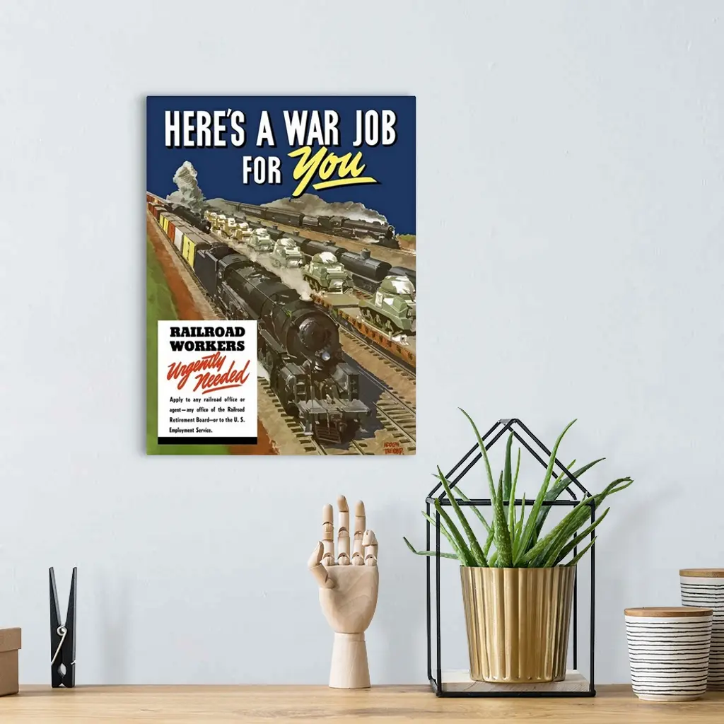 Digitally restored vector war propaganda poster. This vintage World War II poster features trains speeding their cargo down the rails. It declares - Here's a war job for you, Railroad Workers Urgently Needed. Apply to any railroad office or agent, any offices of the railroad retirement board, or to the U.S. Employment Service.