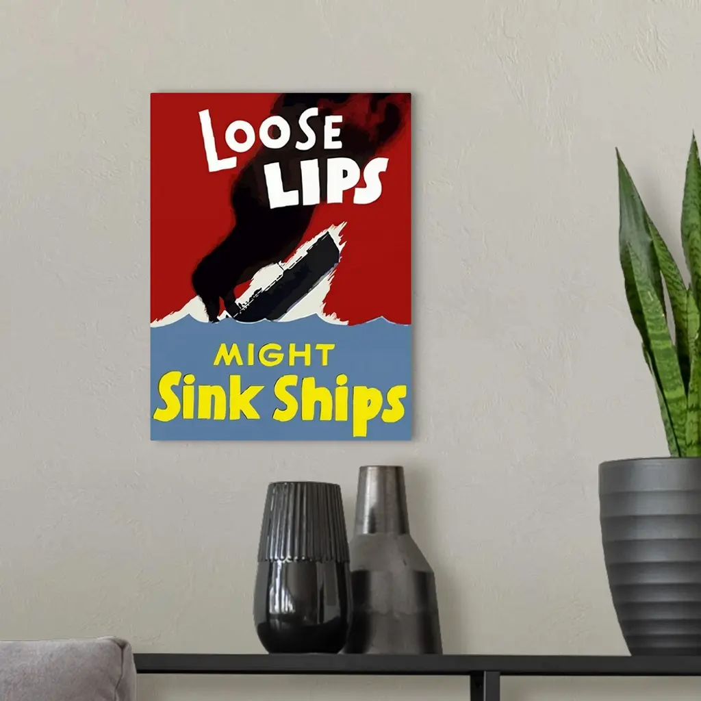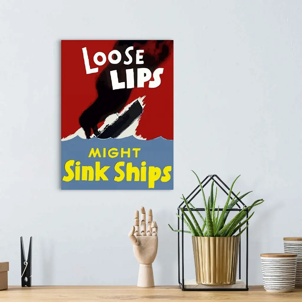 This vintage WWII poster features a sinking ship on the ocean. It declares - Loose Lips Might Sink Ships.