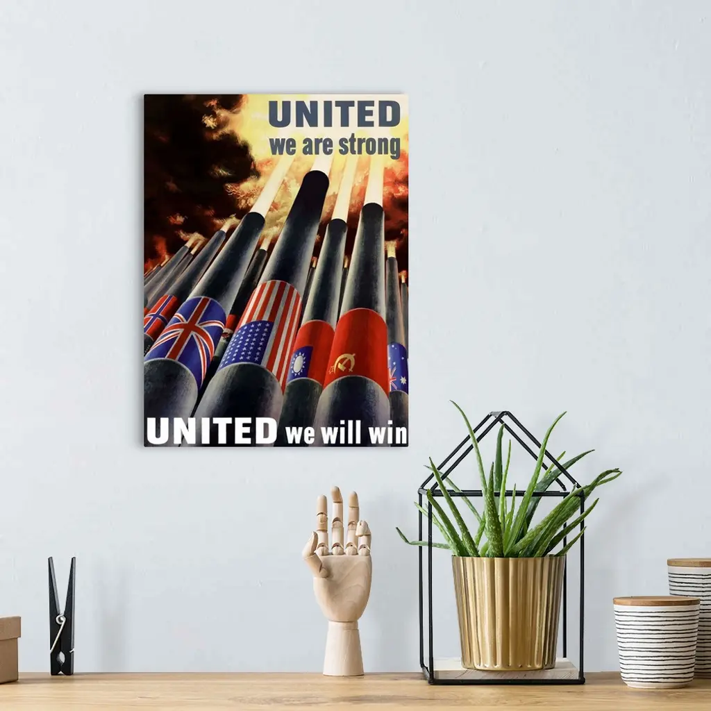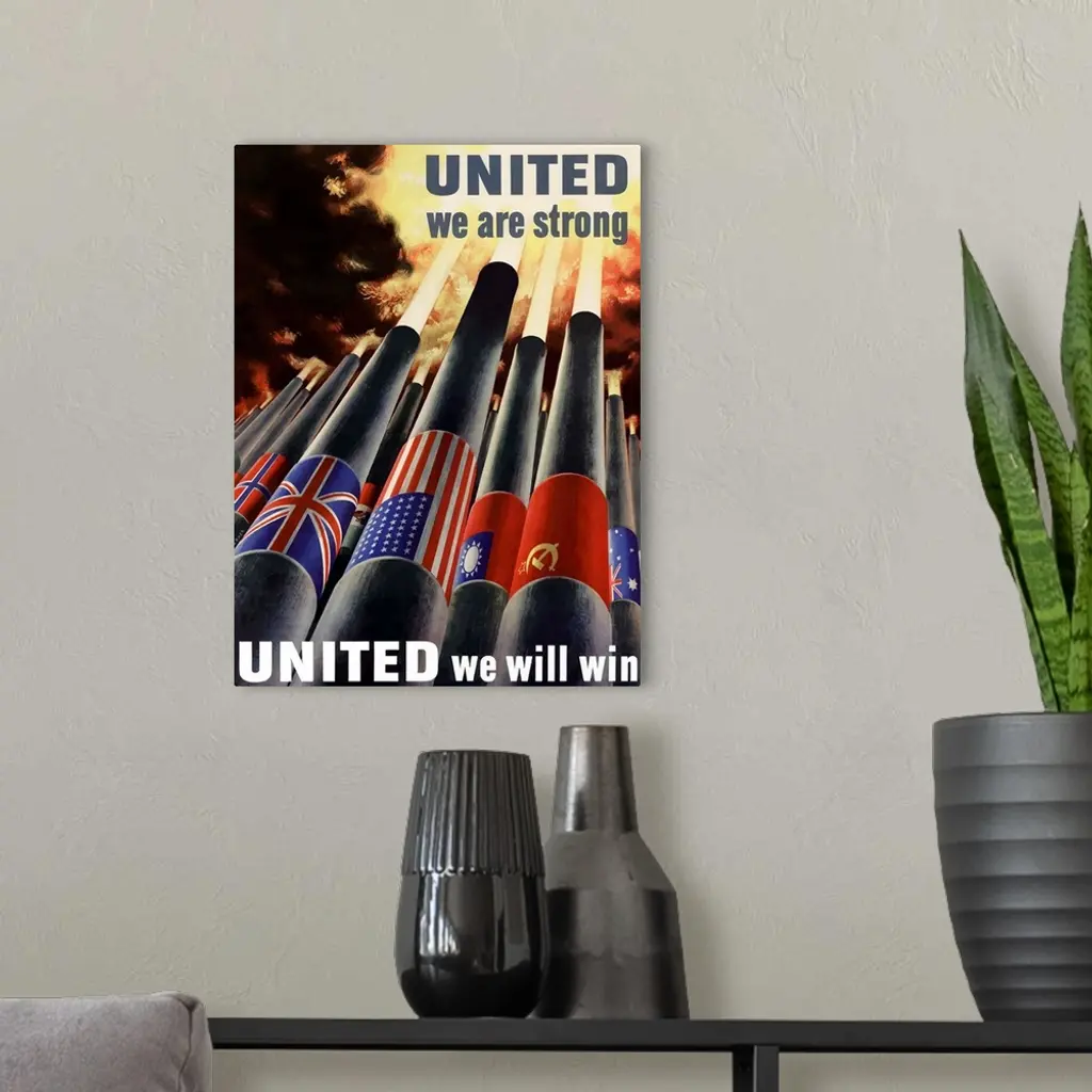 Digitally restored vector war propaganda poster. This vintage war poster declares - United We Are Strong, United Will Win. It features the flags of the Allied Nations during World War Two attached to cannons firing into the sky.