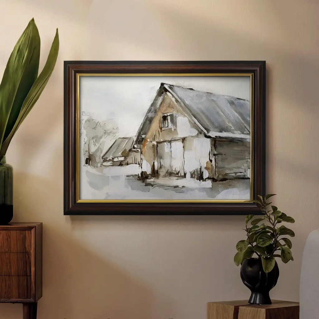 Dilapidated Barn I Premium Framed Canvas- Ready to Hang A Premium Framed Canvas created to last. Framed in distressed wood and available in an array of sizes and colors Featuring a beveled a solid wood stretcher bar, each piece comes ready to hand 3 SIZES AVAILABLE 16''X20'' - Overall Size 18'X27'' - Overall Size 24''x36'' - Overall Size Each piece is made to order. Each piece comes with hanging hardware. Made in the USA Ready to Hang Giclee Paper Print Acrylic Glass Beveled Matt Board