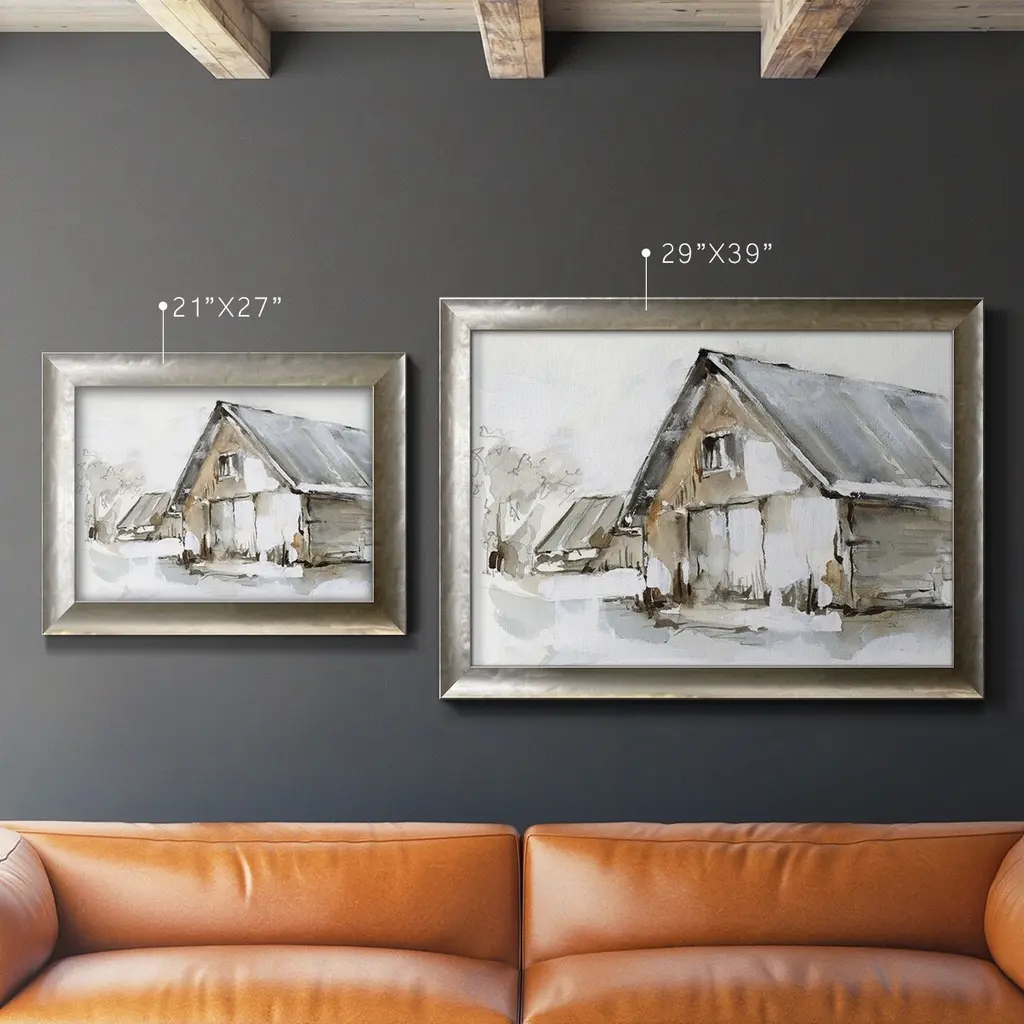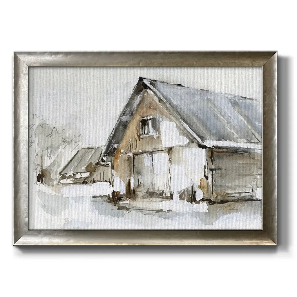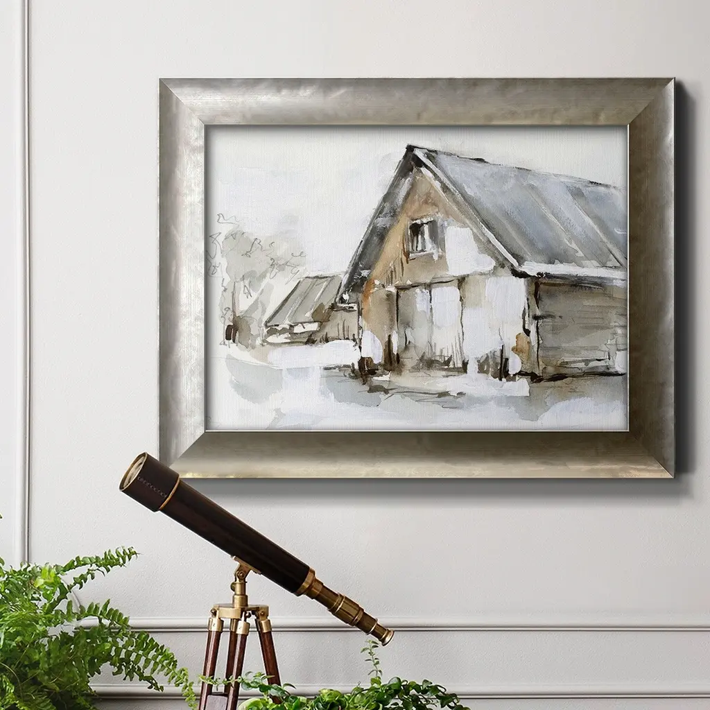 Dilapidated Barn I Premium Framed Canvas- Ready to Hang A Premium Framed Canvas created to last. Framed in distressed wood and available in an array of sizes and colors Featuring a beveled a solid wood stretcher bar, each piece comes ready to hand 3 SIZES AVAILABLE 16''X20'' - Overall Size 18'X27'' - Overall Size 24''x36'' - Overall Size Each piece is made to order. Each piece comes with hanging hardware. Made in the USA Ready to Hang Giclee Paper Print Acrylic Glass Beveled Matt Board