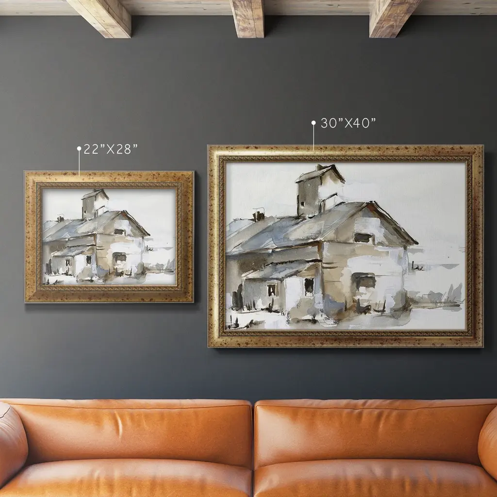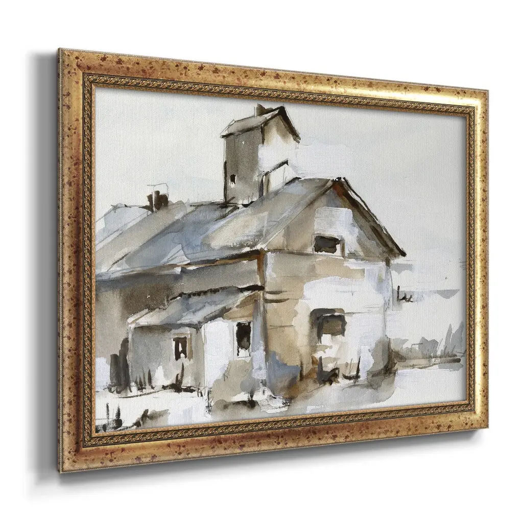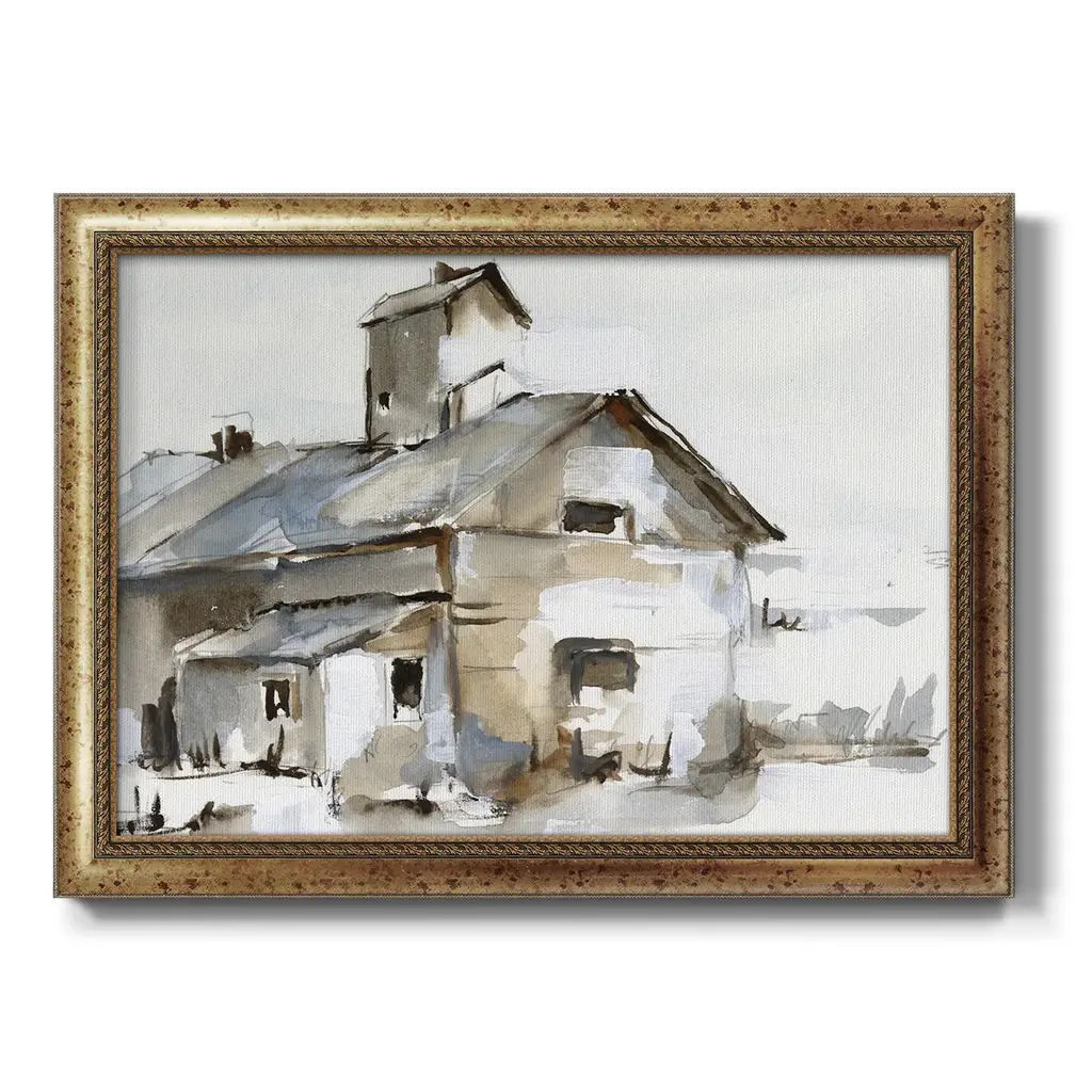 Dilapidated Barn II Premium Framed Canvas- Ready to Hang A Premium Framed Canvas created to last. Framed in distressed wood and available in an array of sizes and colors Featuring a beveled a solid wood stretcher bar, each piece comes ready to hand 3 SIZES AVAILABLE 16''X20'' - Overall Size 18'X27'' - Overall Size 24''x36'' - Overall Size Each piece is made to order. Each piece comes with hanging hardware. Made in the USA Ready to Hang Giclee Paper Print Acrylic Glass Beveled Matt Board