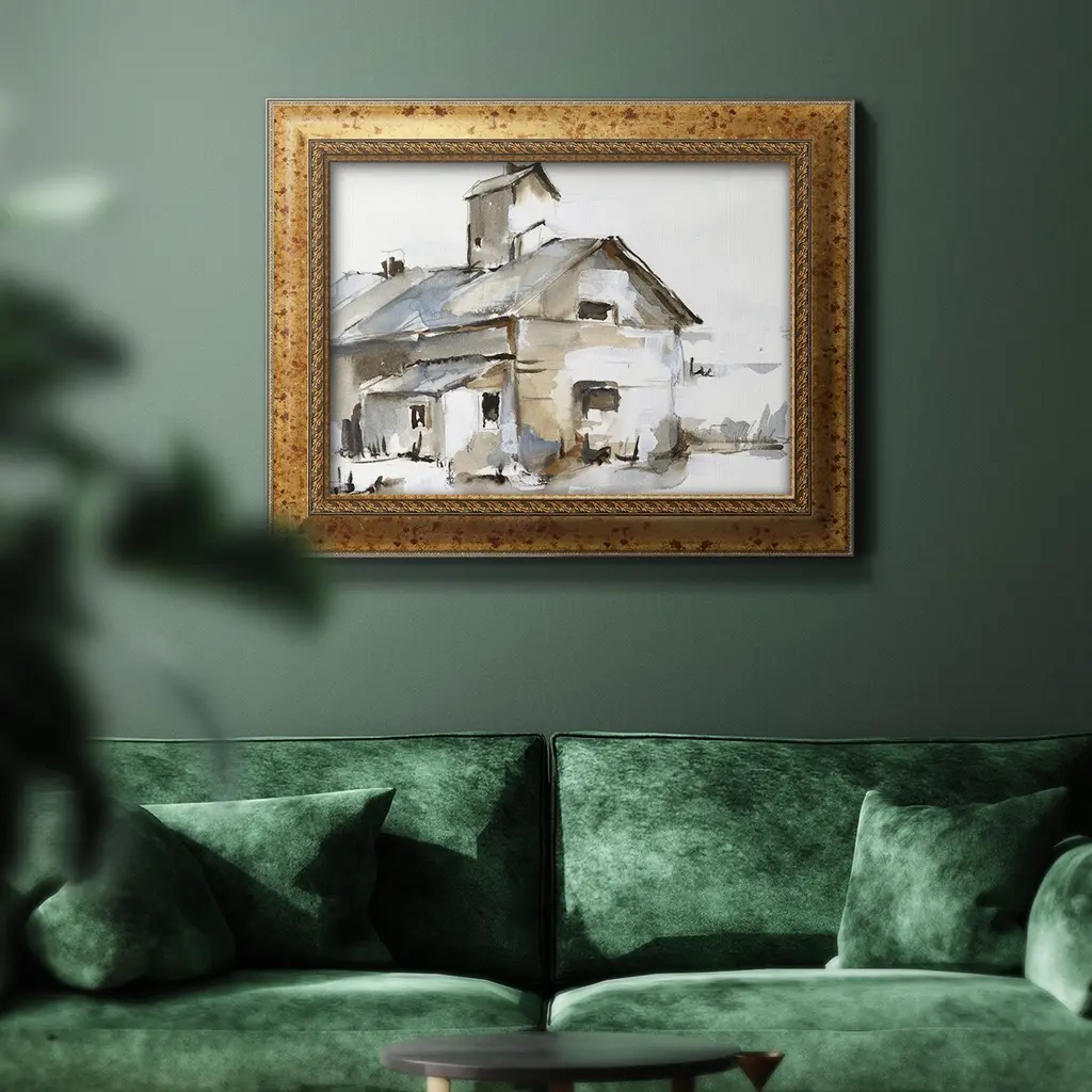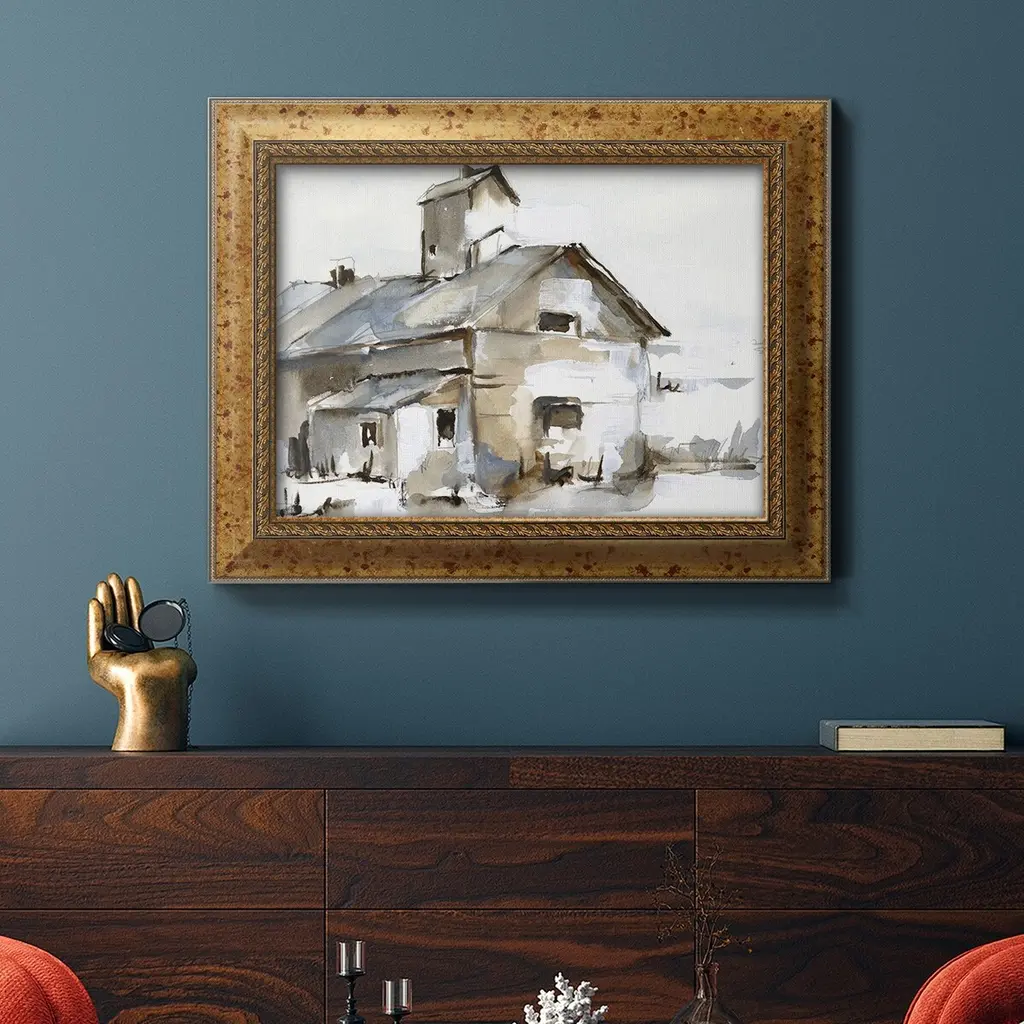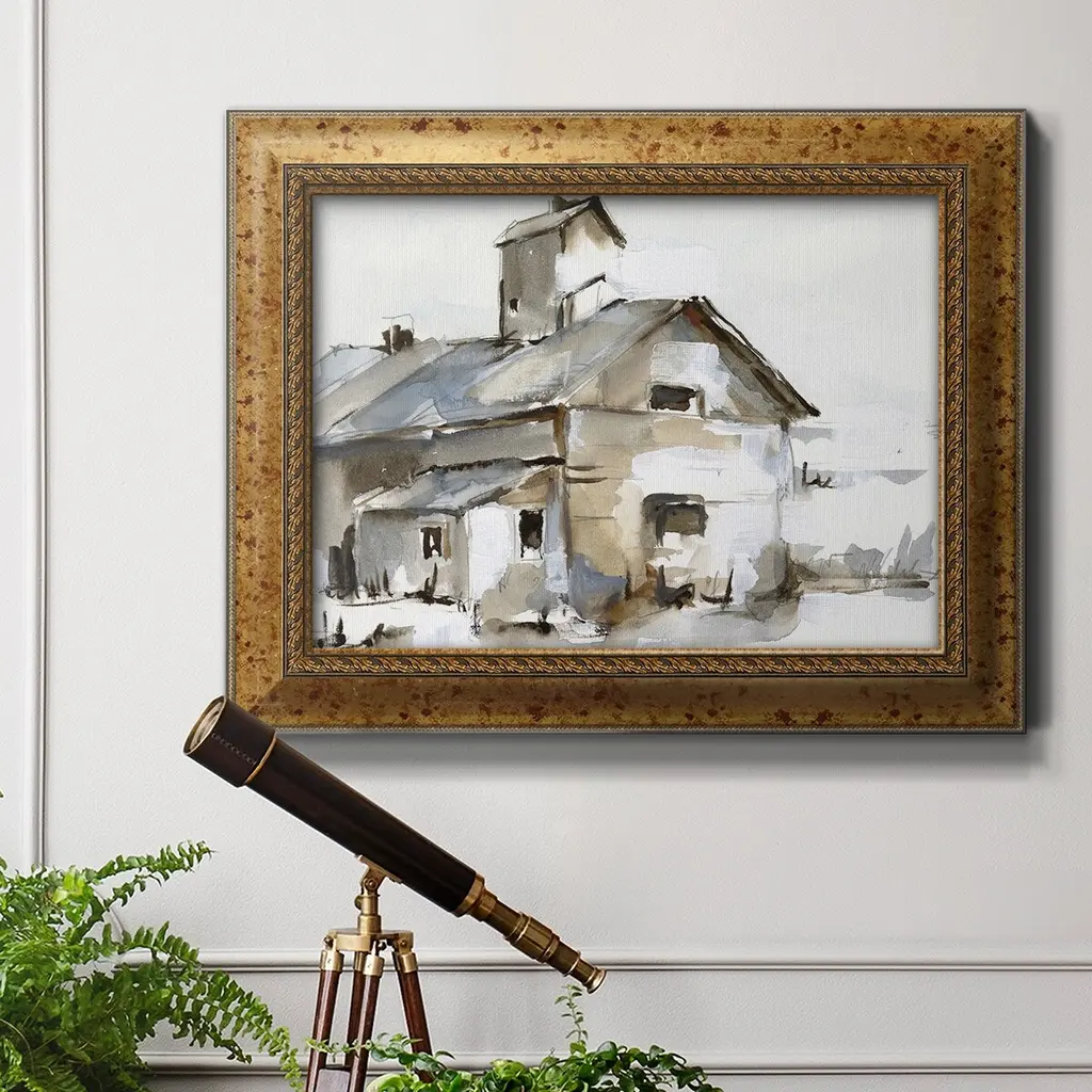 Dilapidated Barn II Premium Framed Canvas- Ready to Hang A Premium Framed Canvas created to last. Framed in distressed wood and available in an array of sizes and colors Featuring a beveled a solid wood stretcher bar, each piece comes ready to hand 3 SIZES AVAILABLE 16''X20'' - Overall Size 18'X27'' - Overall Size 24''x36'' - Overall Size Each piece is made to order. Each piece comes with hanging hardware. Made in the USA Ready to Hang Giclee Paper Print Acrylic Glass Beveled Matt Board