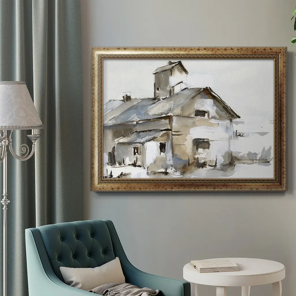 Dilapidated Barn II Premium Framed Canvas- Ready to Hang A Premium Framed Canvas created to last. Framed in distressed wood and available in an array of sizes and colors Featuring a beveled a solid wood stretcher bar, each piece comes ready to hand 3 SIZES AVAILABLE 16''X20'' - Overall Size 18'X27'' - Overall Size 24''x36'' - Overall Size Each piece is made to order. Each piece comes with hanging hardware. Made in the USA Ready to Hang Giclee Paper Print Acrylic Glass Beveled Matt Board