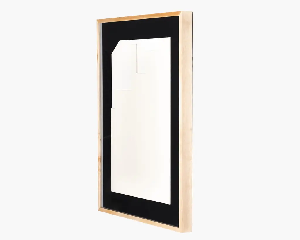Shape-driven cutouts from layered mat boards, by Bangkok-based art house Coup D'Esprit. Framed within natural maple for a gallery-quality look. Size shown is print size, add frame thickness to print size for total frame size Weight: 20 lbs Matte paper Shipping box: 35" W x 4.5" D x 45" H, 25lbs.