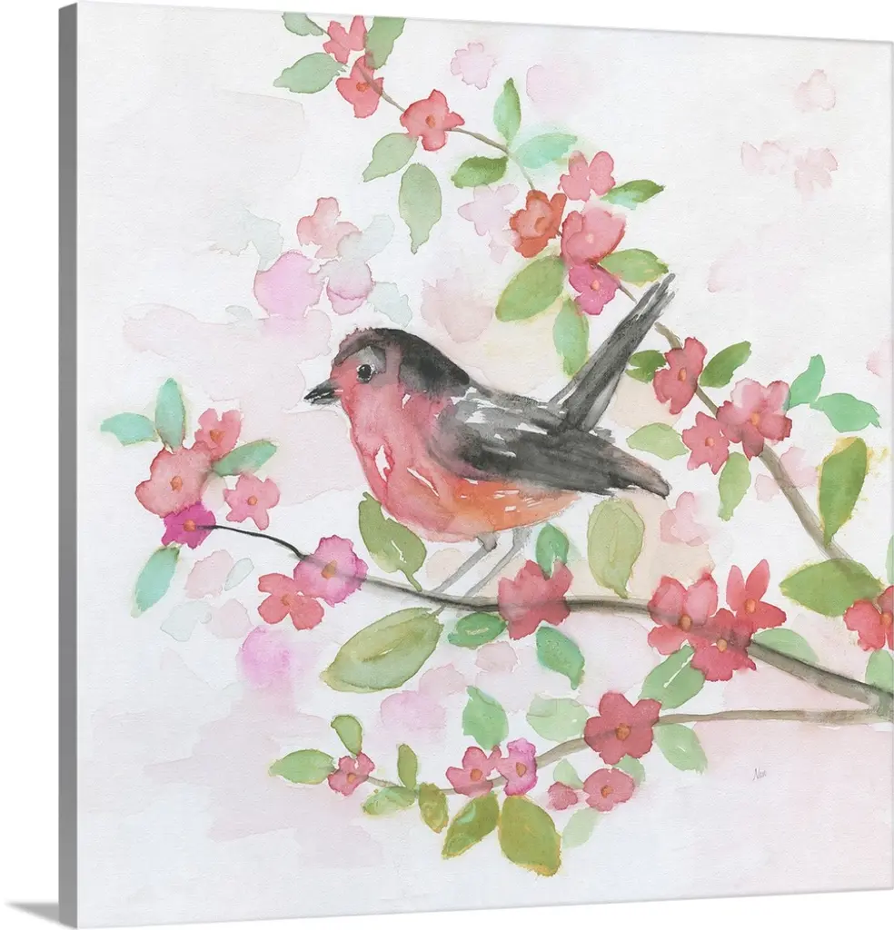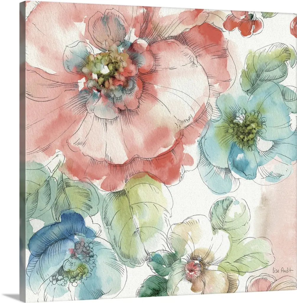 Flowers and Feathers IV by Dina June is a high quality piece of canvas artwork. The finished size of this piece is 12" X 12", and it has a depth 1.5" with wintergray painted sides. There is a UV protective coating over the entire image, and it is ready to hang on your wall with no hardware required.