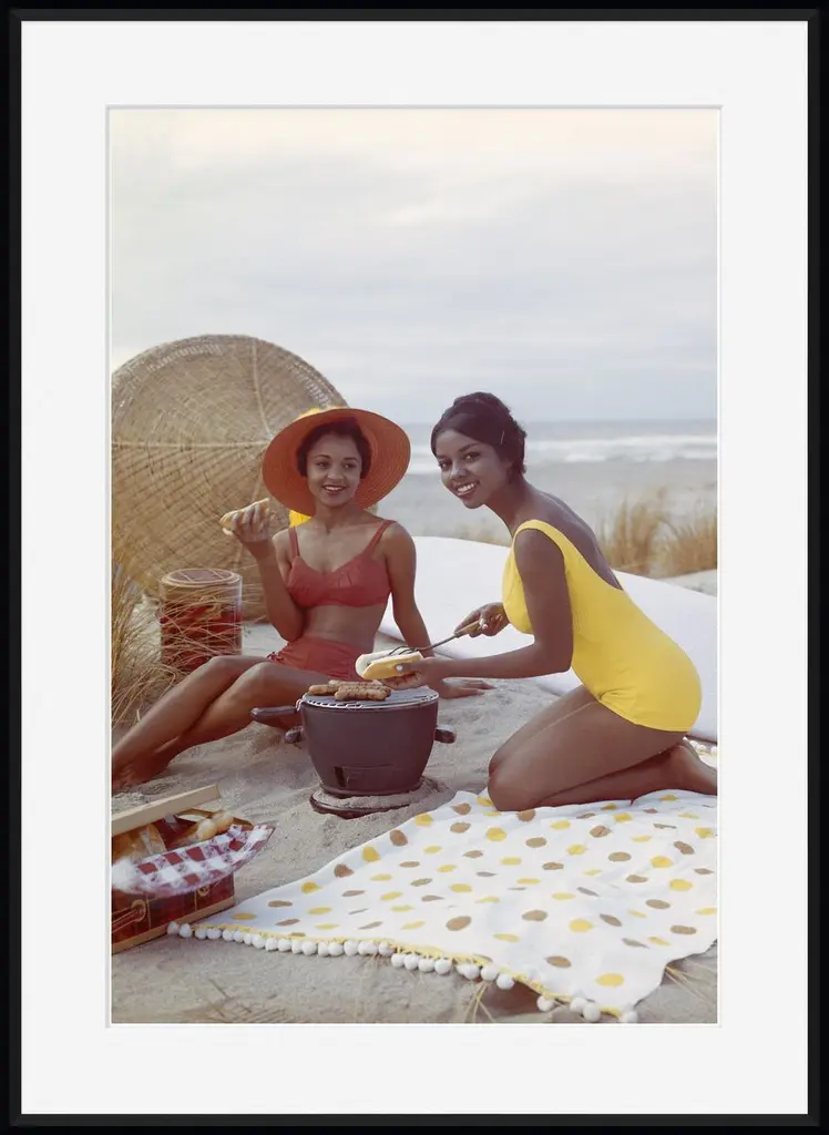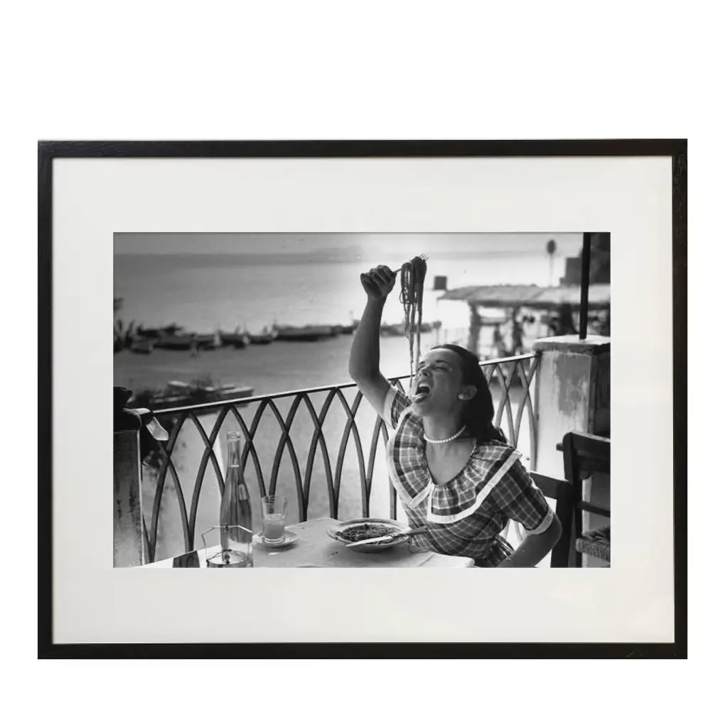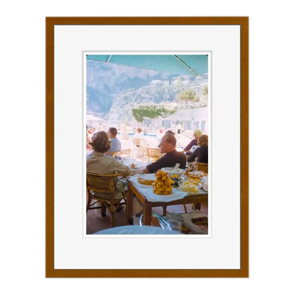 This C-type photographic print (51x76 cm) of the original shot in August 1980 willl strike with its high-definition and vibrant tones. Imposing stacks emerging from the waters of the island of Capri act as backdrop for a delicious al fresco dinner, where Italian artist and actress Domiziana Giordano, Italian author Francesca Sanvitale, Dino Trappetti, and fashion designer Umberto Terrelli are enjoying local food on a breath-taking terrace. A wooden frame is included. Prints from the Slim Aarons Archive, owned and housed by Getty Images. All photographs are printed and authorised by the Getty Images Gallery, London. Accompanied by certificate of authenticity.