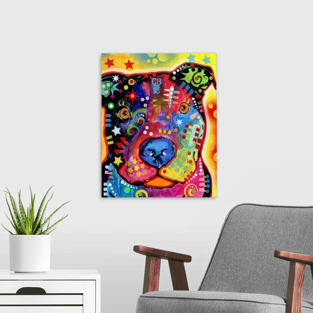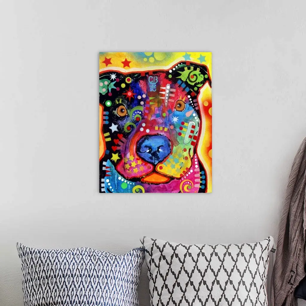 Contemporary stencil painting of a dog filled with various colors and patterns.