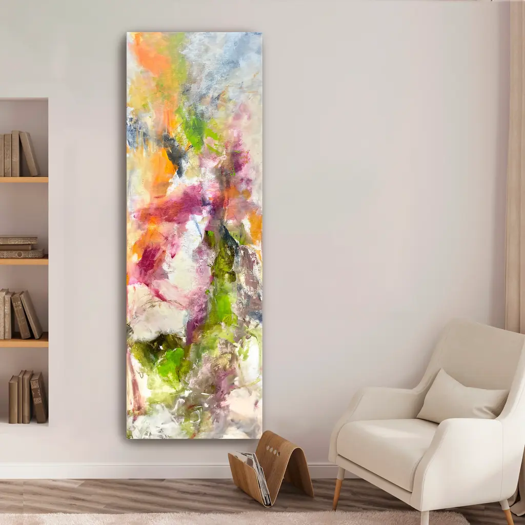 This vivid abstract composition swirls with rich hues and layered brushstrokes, creating an immersive experience of color and light. Its dynamic interplay of vibrant tones invites energy and creativity into modern interiors. Our Gallery Wrap Canvas Prints are proudly assembled with high quality materials in California, USA. Each piece is printed on a thick, archival grade canvas using Giclee technology. It is then hand-stretched by our experienced artisans over solid wood bars, which will not warp over time. The final product is a piece personally crafted for you to confidently display on your wall. Care and Assembly: Ensure that the location of your piece has little to no exposure to heat, sunlight, and moisture. Wipe clean, only if needed. Each piece includes hanging hardware to hang on your wall vertically.