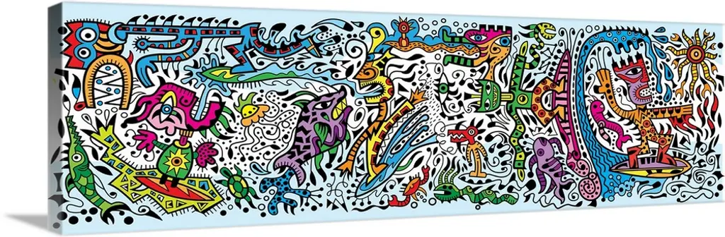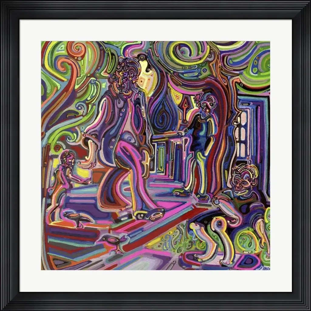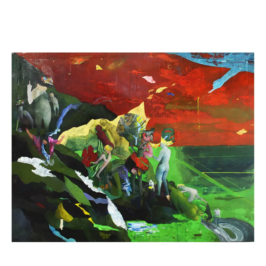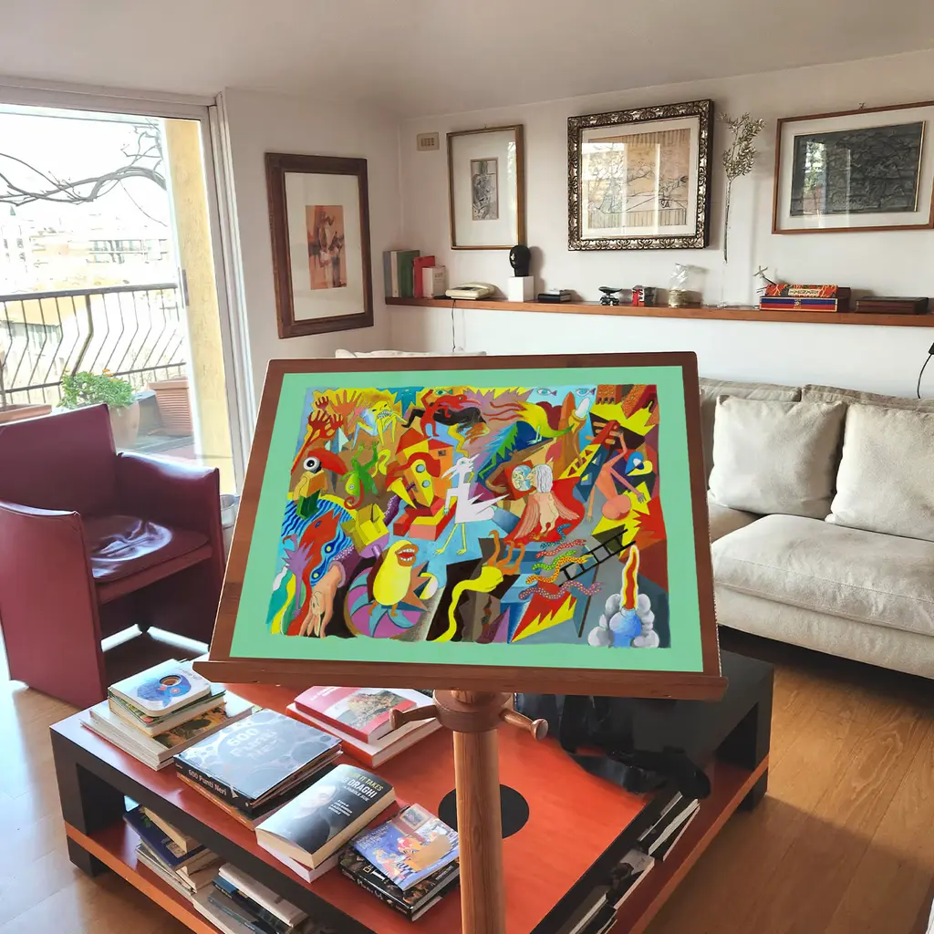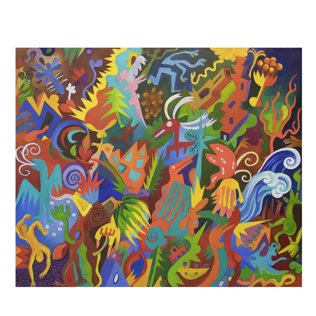 Artist Alessandra Zorzi's visionary sensibility is splendidly exemplified in this one-of-a-kind painting, which evokes the redeeming power of recklessness. A daring combination of anthropomorphic, zoomorphic, and phytomorphic traits distinguishes the creatures crowding the scene, a chaos that results further and cleverly dramatized by the use of vibrant contrasting colors. Frame not included.