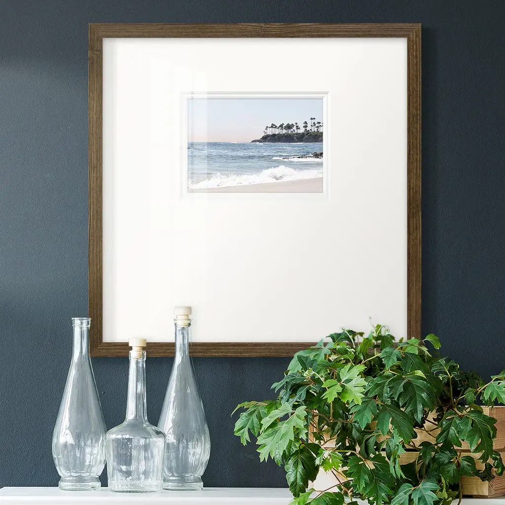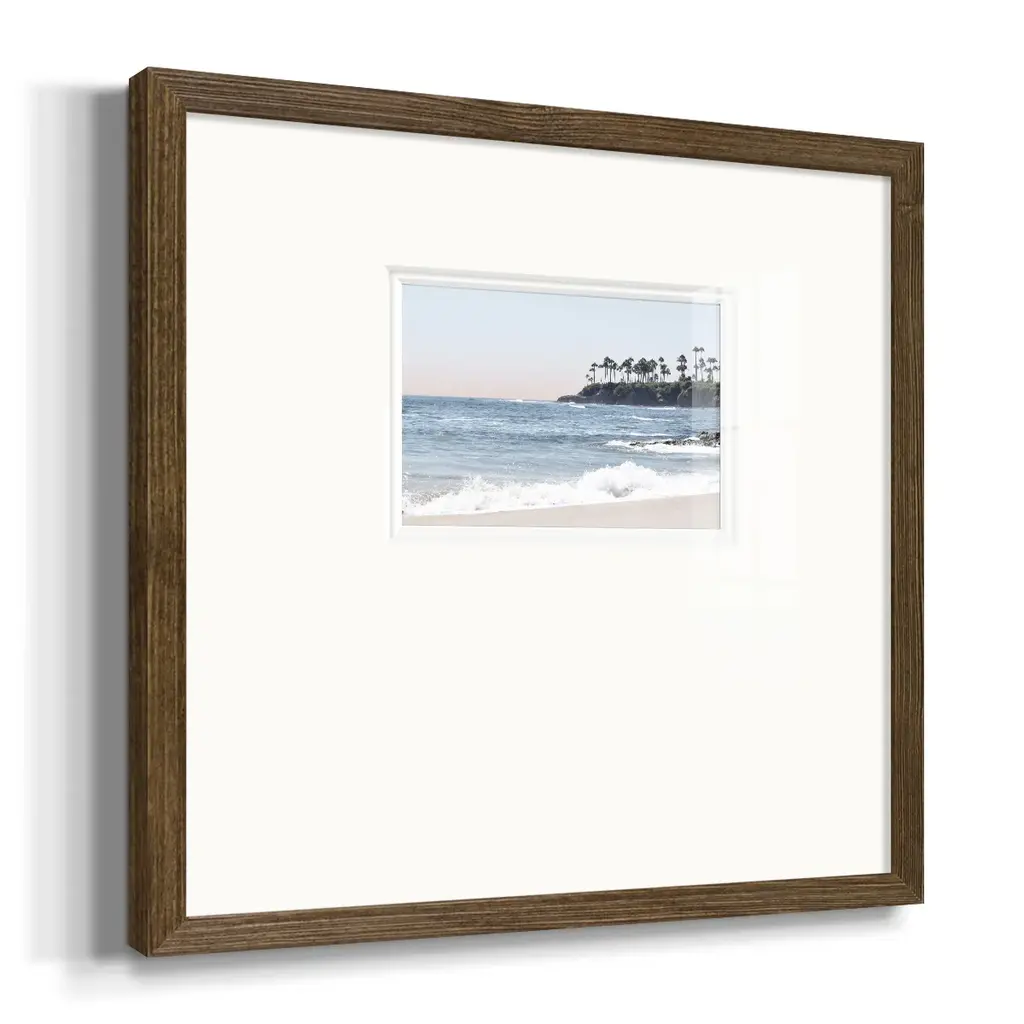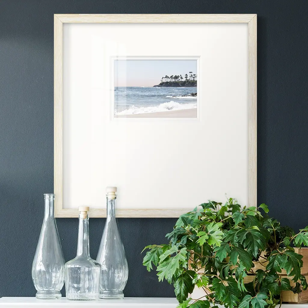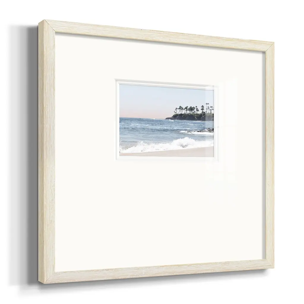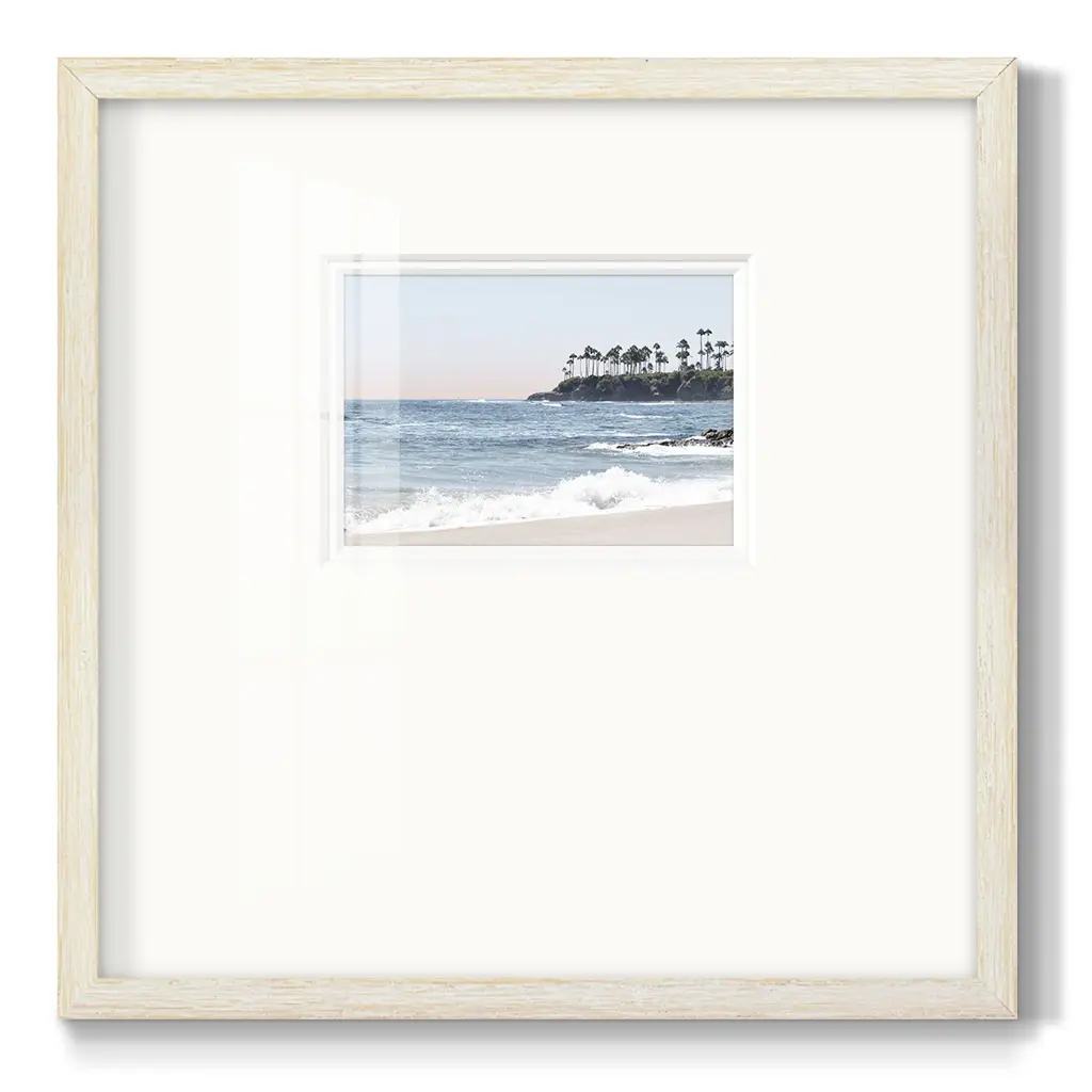 Distant PalmsPremium Framed Print A framed cold pressed paper print featuring superior double matting and quality frame. 2 SIZES AVAILABLE 16''X16''' - Overall Size 20''X20''' - Overall Size Each piece is made to order. Each piece comes with hanging hardware. Made in the USA Ready to Hang Giclee Paper Print Plexiglass Beveled Matt Board Double Matte Board