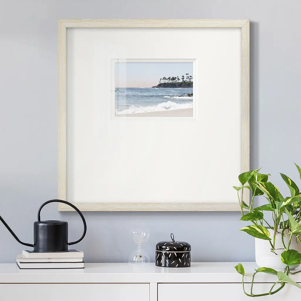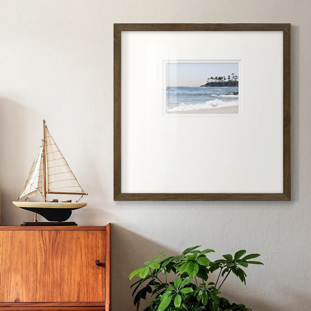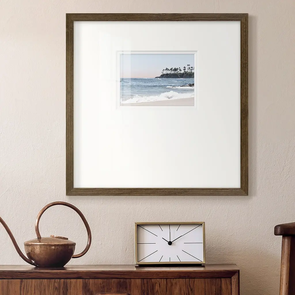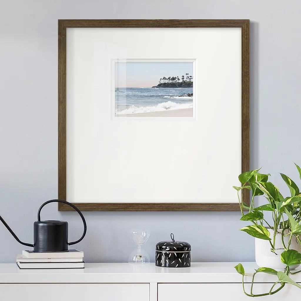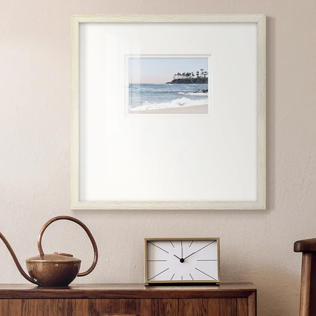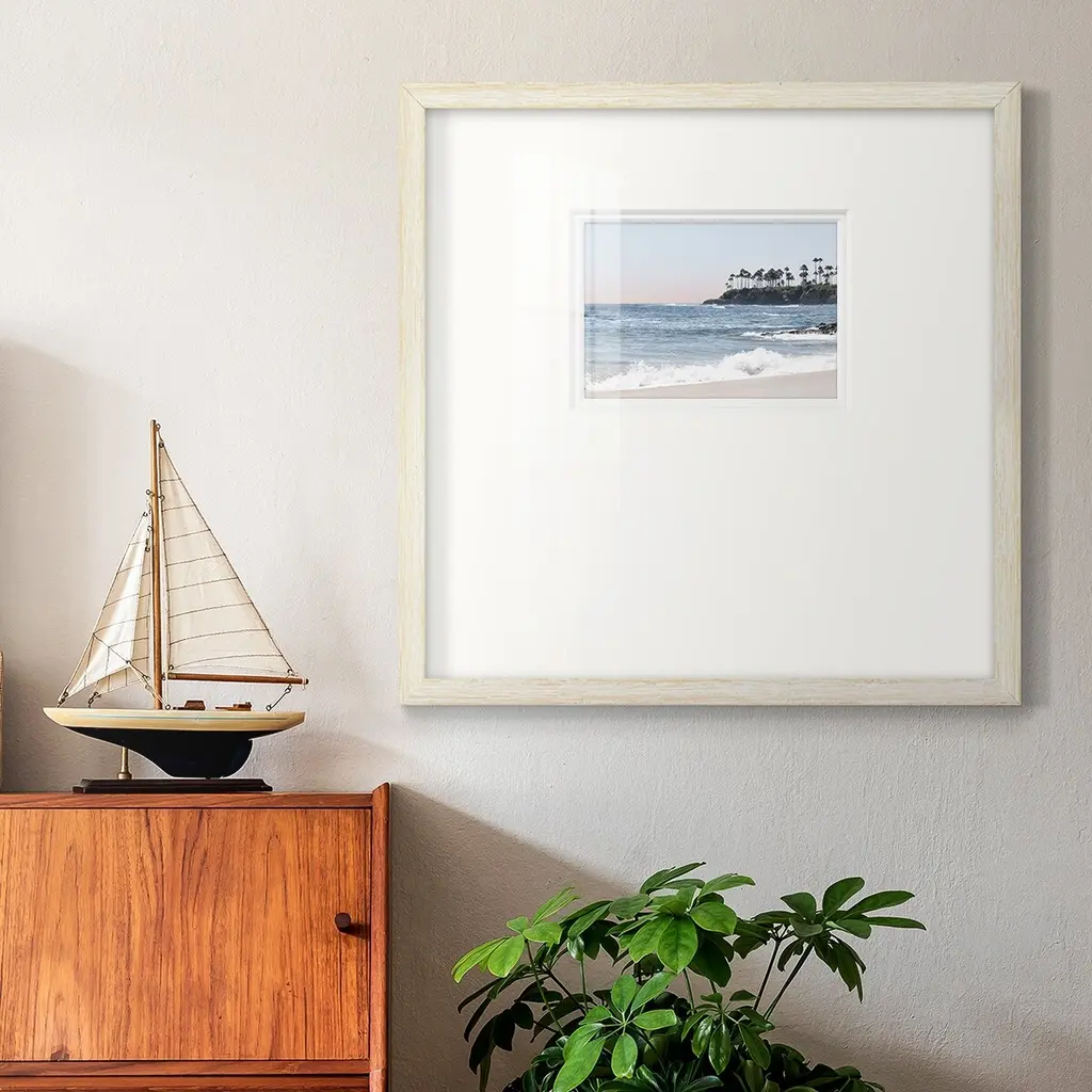 Distant PalmsPremium Framed Print A framed cold pressed paper print featuring superior double matting and quality frame. 2 SIZES AVAILABLE 16''X16''' - Overall Size 20''X20''' - Overall Size Each piece is made to order. Each piece comes with hanging hardware. Made in the USA Ready to Hang Giclee Paper Print Plexiglass Beveled Matt Board Double Matte Board