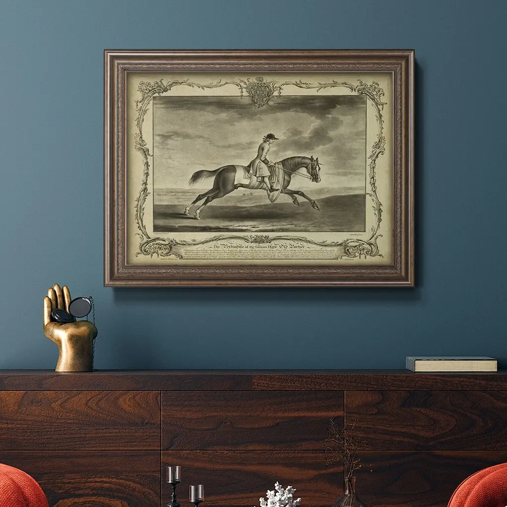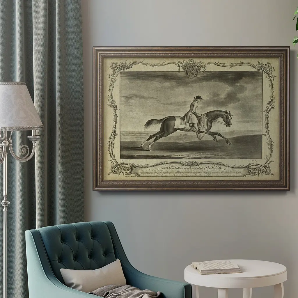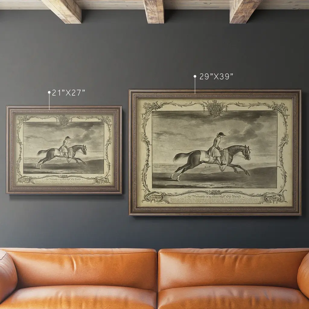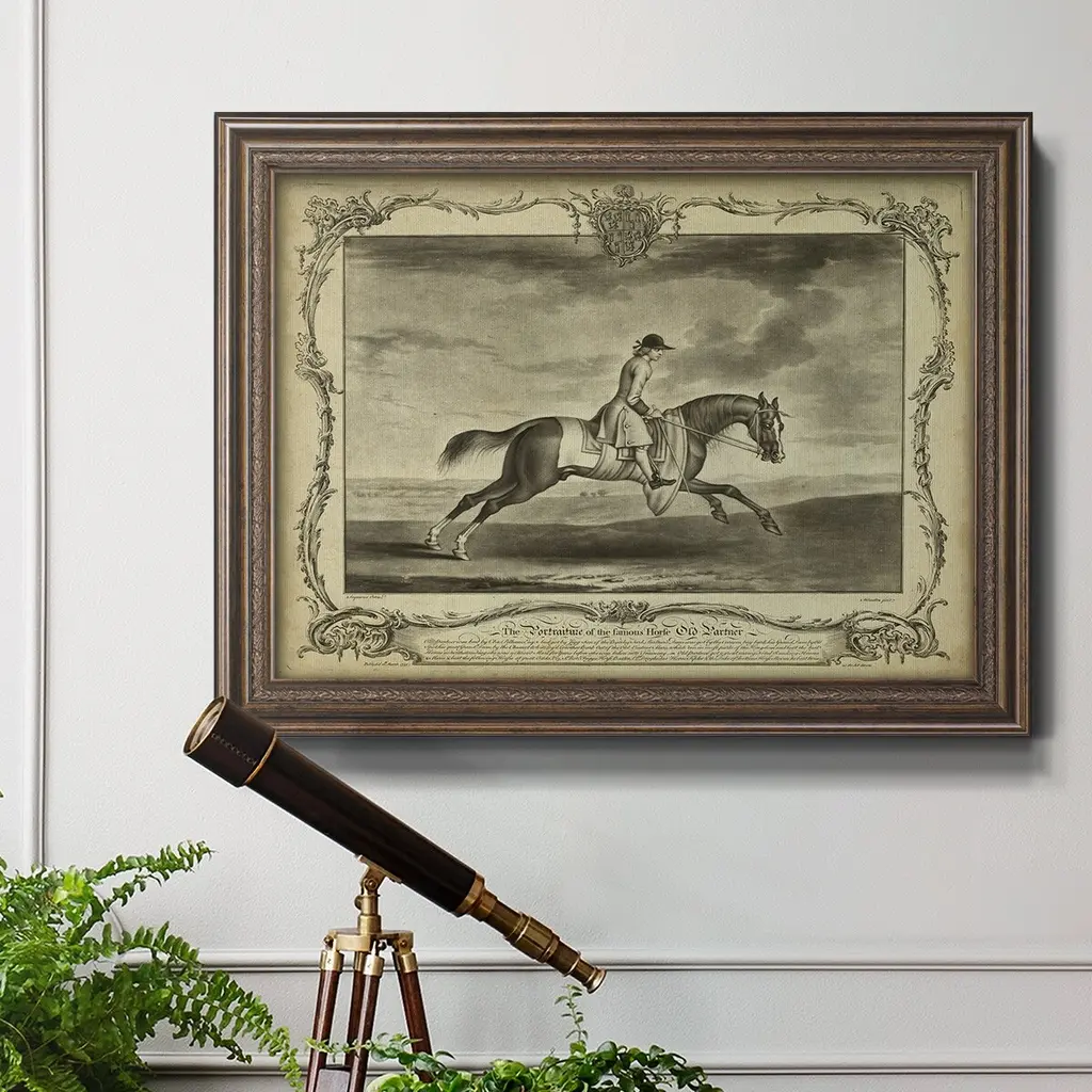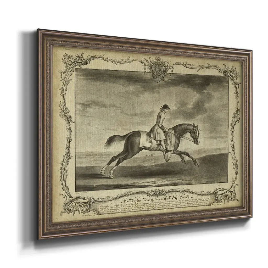Distinguished Horses I Premium Framed Canvas- Ready to Hang A Premium Framed Canvas created to last. Framed in distressed wood and available in an array of sizes and colors Featuring a beveled a solid wood stretcher bar, each piece comes ready to hand 3 SIZES AVAILABLE 16''X20'' - Overall Size 18'X27'' - Overall Size 24''x36'' - Overall Size Each piece is made to order. Each piece comes with hanging hardware. Made in the USA Ready to Hang Giclee Paper Print Acrylic Glass Beveled Matt Board