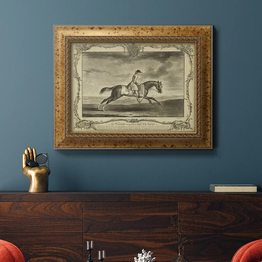 Distinguished Horses I Premium Framed Canvas- Ready to Hang A Premium Framed Canvas created to last. Framed in distressed wood and available in an array of sizes and colors Featuring a beveled a solid wood stretcher bar, each piece comes ready to hand 3 SIZES AVAILABLE 16''X20'' - Overall Size 18'X27'' - Overall Size 24''x36'' - Overall Size Each piece is made to order. Each piece comes with hanging hardware. Made in the USA Ready to Hang Giclee Paper Print Acrylic Glass Beveled Matt Board