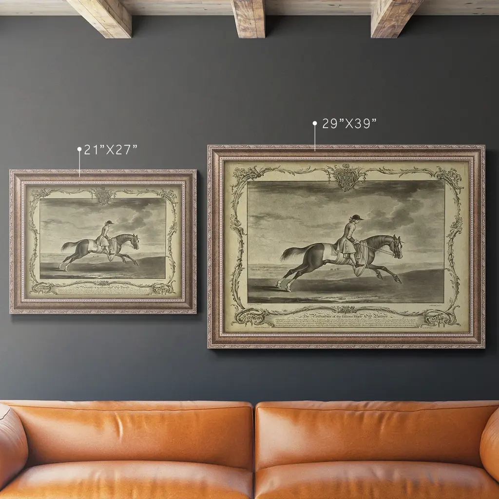 Distinguished Horses I Premium Framed Canvas- Ready to Hang A Premium Framed Canvas created to last. Framed in distressed wood and available in an array of sizes and colors Featuring a beveled a solid wood stretcher bar, each piece comes ready to hand 3 SIZES AVAILABLE 16''X20'' - Overall Size 18'X27'' - Overall Size 24''x36'' - Overall Size Each piece is made to order. Each piece comes with hanging hardware. Made in the USA Ready to Hang Giclee Paper Print Acrylic Glass Beveled Matt Board