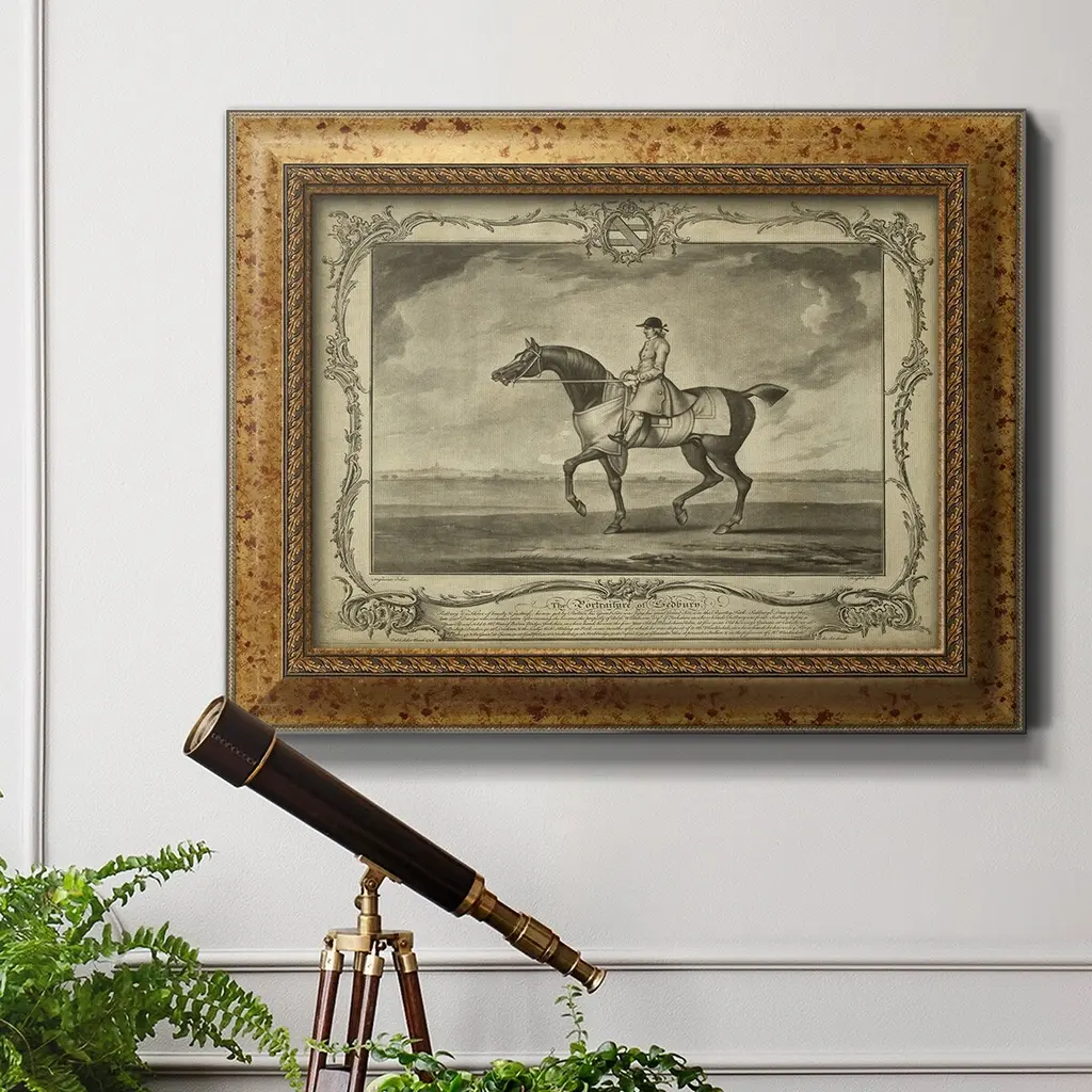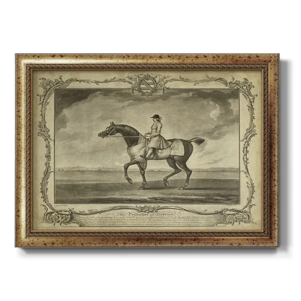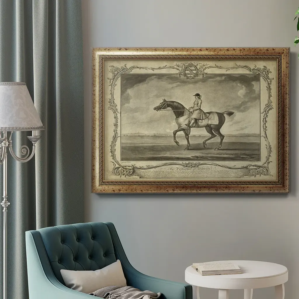Distinguished Horses II Premium Framed Canvas- Ready to Hang A Premium Framed Canvas created to last. Framed in distressed wood and available in an array of sizes and colors Featuring a beveled a solid wood stretcher bar, each piece comes ready to hand 3 SIZES AVAILABLE 16''X20'' - Overall Size 18'X27'' - Overall Size 24''x36'' - Overall Size Each piece is made to order. Each piece comes with hanging hardware. Made in the USA Ready to Hang Giclee Paper Print Acrylic Glass Beveled Matt Board