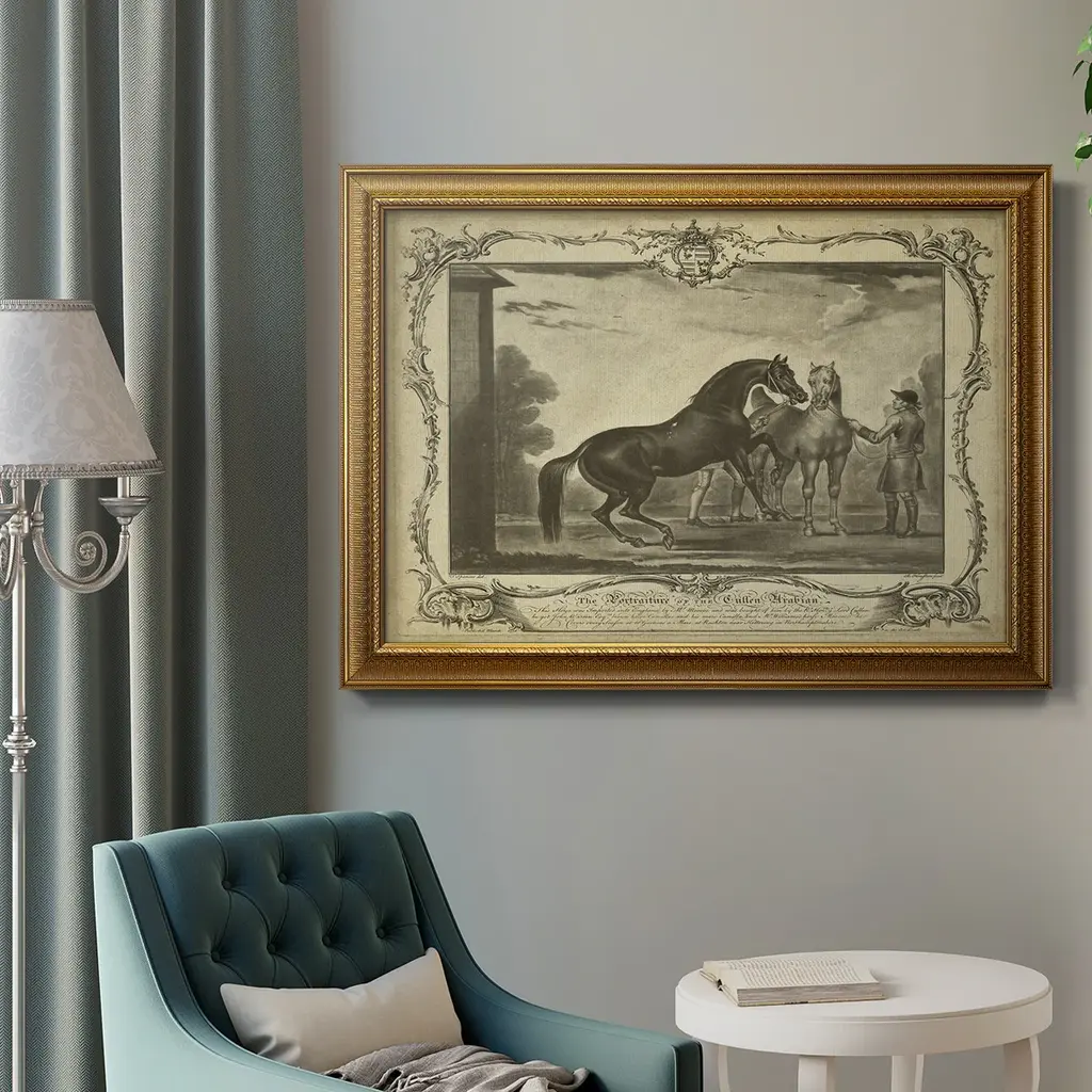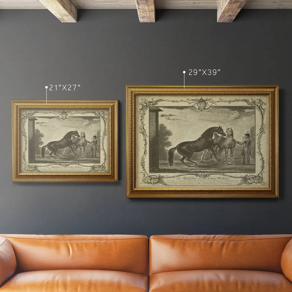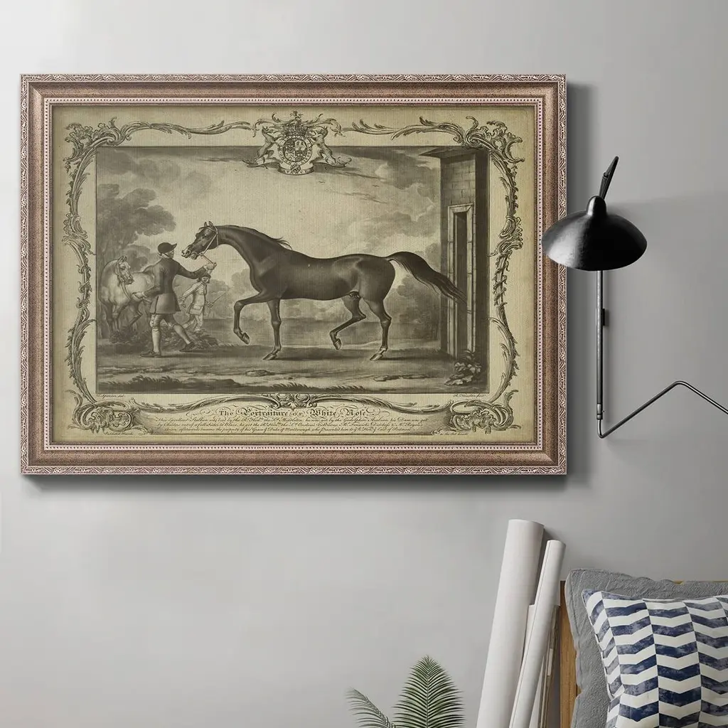 Distinguished Horses III Premium Framed Canvas- Ready to Hang A Premium Framed Canvas created to last. Framed in distressed wood and available in an array of sizes and colors Featuring a beveled a solid wood stretcher bar, each piece comes ready to hand 3 SIZES AVAILABLE 16''X20'' - Overall Size 18'X27'' - Overall Size 24''x36'' - Overall Size Each piece is made to order. Each piece comes with hanging hardware. Made in the USA Ready to Hang Giclee Paper Print Acrylic Glass Beveled Matt Board
