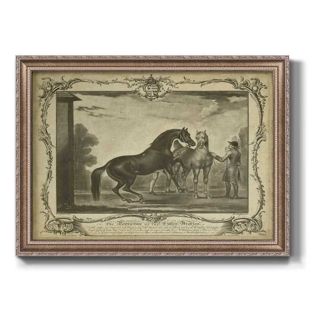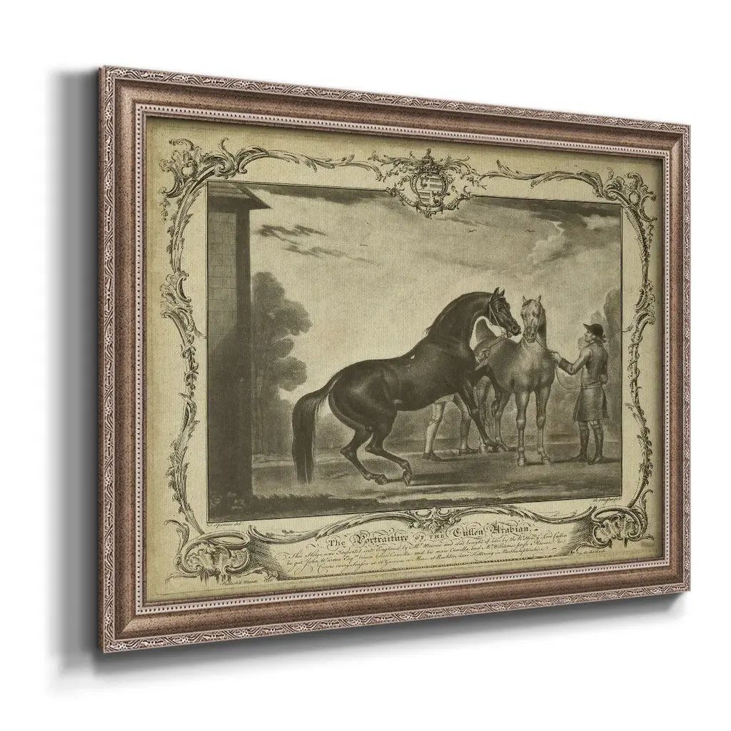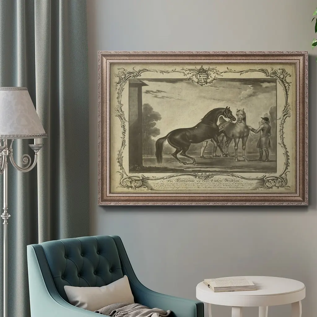 Distinguished Horses III Premium Framed Canvas- Ready to Hang A Premium Framed Canvas created to last. Framed in distressed wood and available in an array of sizes and colors Featuring a beveled a solid wood stretcher bar, each piece comes ready to hand 3 SIZES AVAILABLE 16''X20'' - Overall Size 18'X27'' - Overall Size 24''x36'' - Overall Size Each piece is made to order. Each piece comes with hanging hardware. Made in the USA Ready to Hang Giclee Paper Print Acrylic Glass Beveled Matt Board