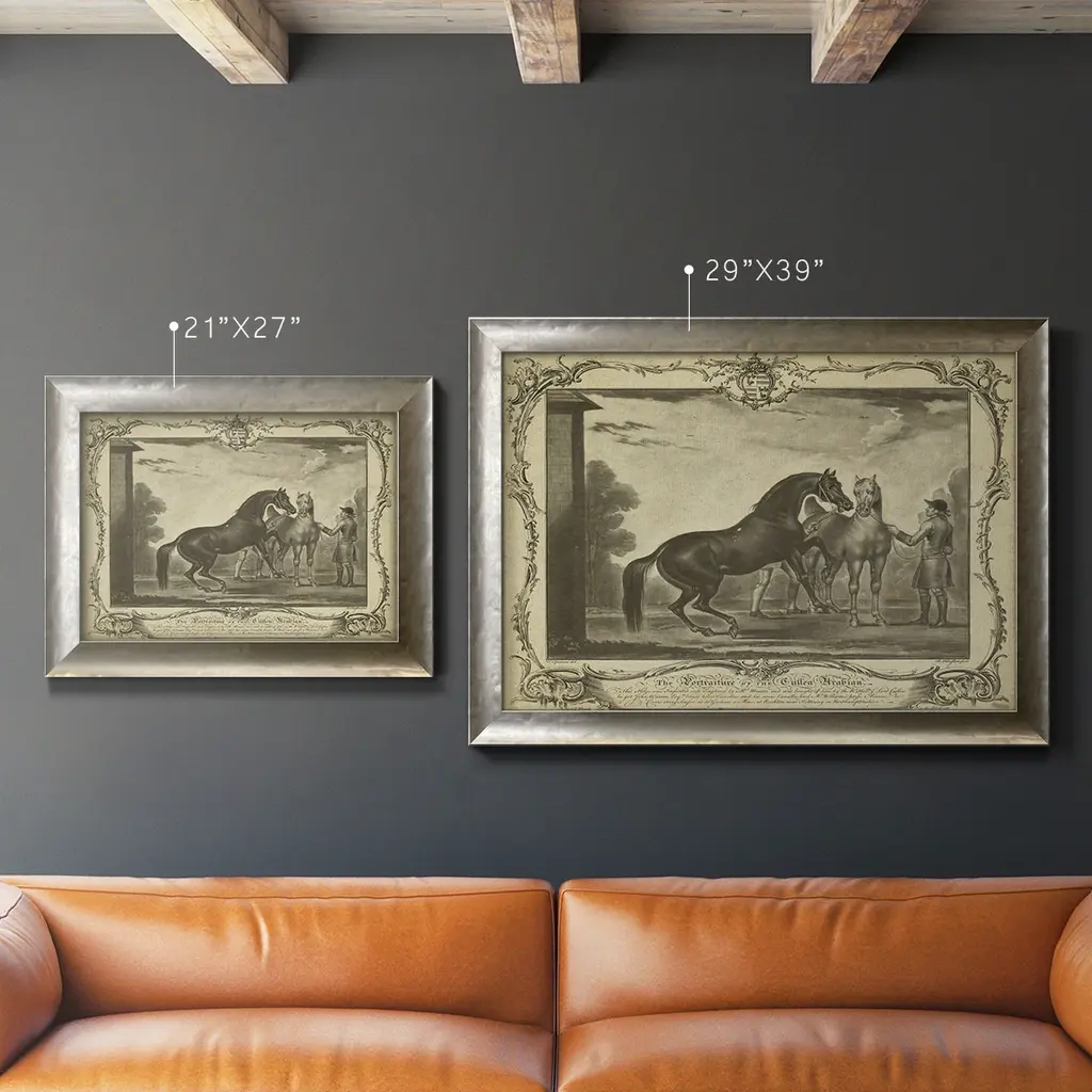 Distinguished Horses III Premium Framed Canvas- Ready to Hang A Premium Framed Canvas created to last. Framed in distressed wood and available in an array of sizes and colors Featuring a beveled a solid wood stretcher bar, each piece comes ready to hand 3 SIZES AVAILABLE 16''X20'' - Overall Size 18'X27'' - Overall Size 24''x36'' - Overall Size Each piece is made to order. Each piece comes with hanging hardware. Made in the USA Ready to Hang Giclee Paper Print Acrylic Glass Beveled Matt Board
