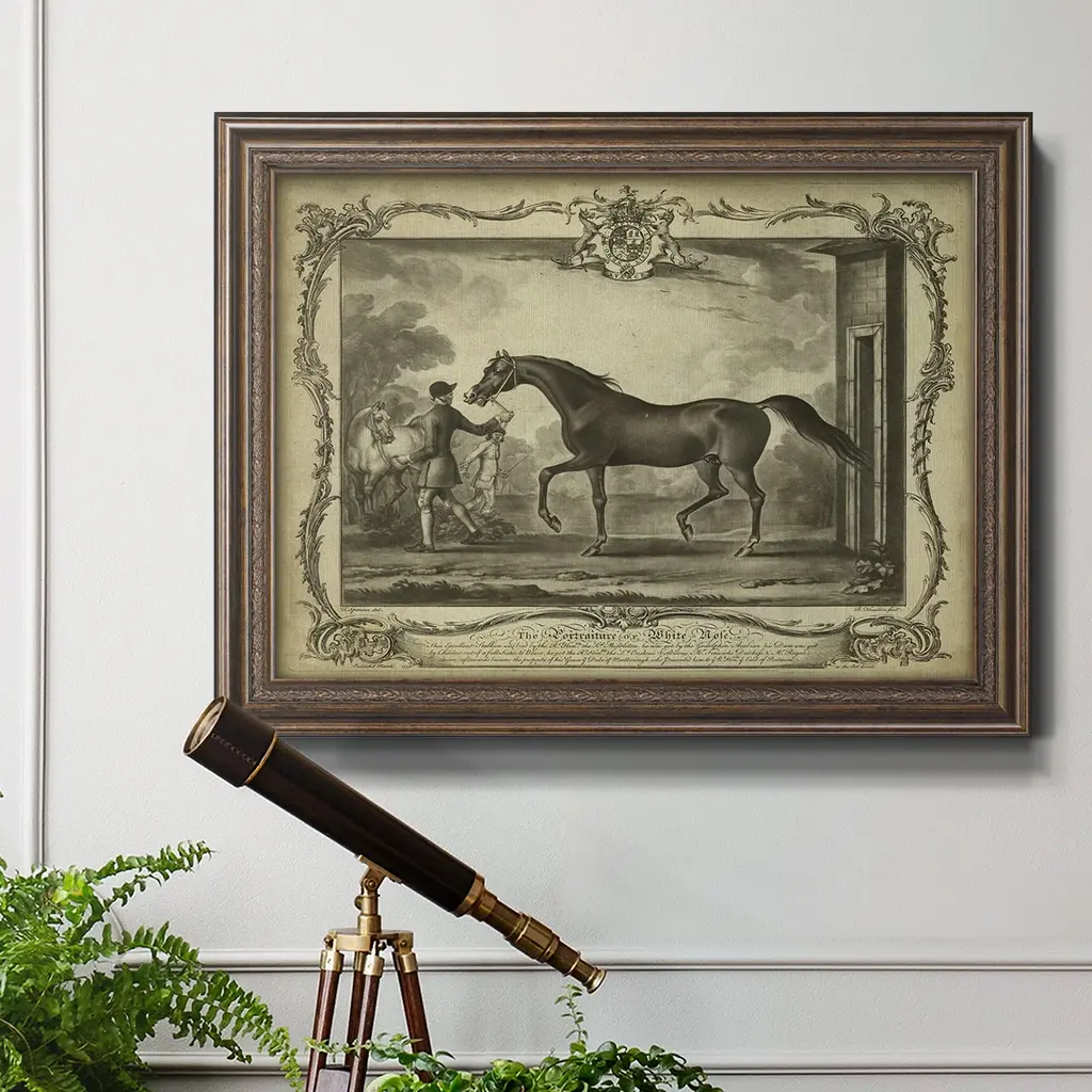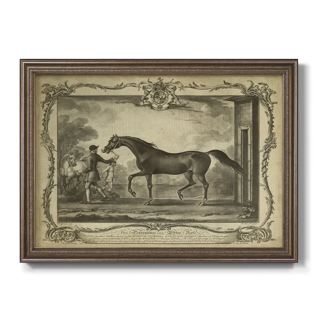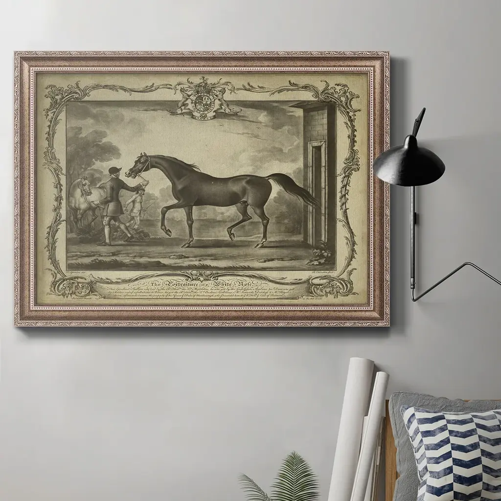 Distinguished Horses IV Premium Framed Canvas- Ready to Hang A Premium Framed Canvas created to last. Framed in distressed wood and available in an array of sizes and colors Featuring a beveled a solid wood stretcher bar, each piece comes ready to hand 3 SIZES AVAILABLE 16''X20'' - Overall Size 18'X27'' - Overall Size 24''x36'' - Overall Size Each piece is made to order. Each piece comes with hanging hardware. Made in the USA Ready to Hang Giclee Paper Print Acrylic Glass Beveled Matt Board