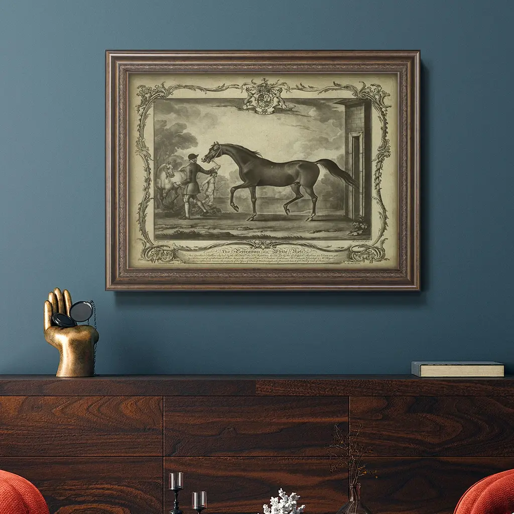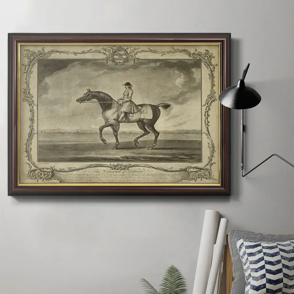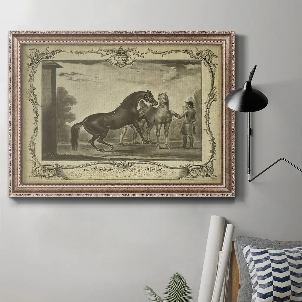 Distinguished Horses IV Premium Framed Canvas- Ready to Hang A Premium Framed Canvas created to last. Framed in distressed wood and available in an array of sizes and colors Featuring a beveled a solid wood stretcher bar, each piece comes ready to hand 3 SIZES AVAILABLE 16''X20'' - Overall Size 18'X27'' - Overall Size 24''x36'' - Overall Size Each piece is made to order. Each piece comes with hanging hardware. Made in the USA Ready to Hang Giclee Paper Print Acrylic Glass Beveled Matt Board