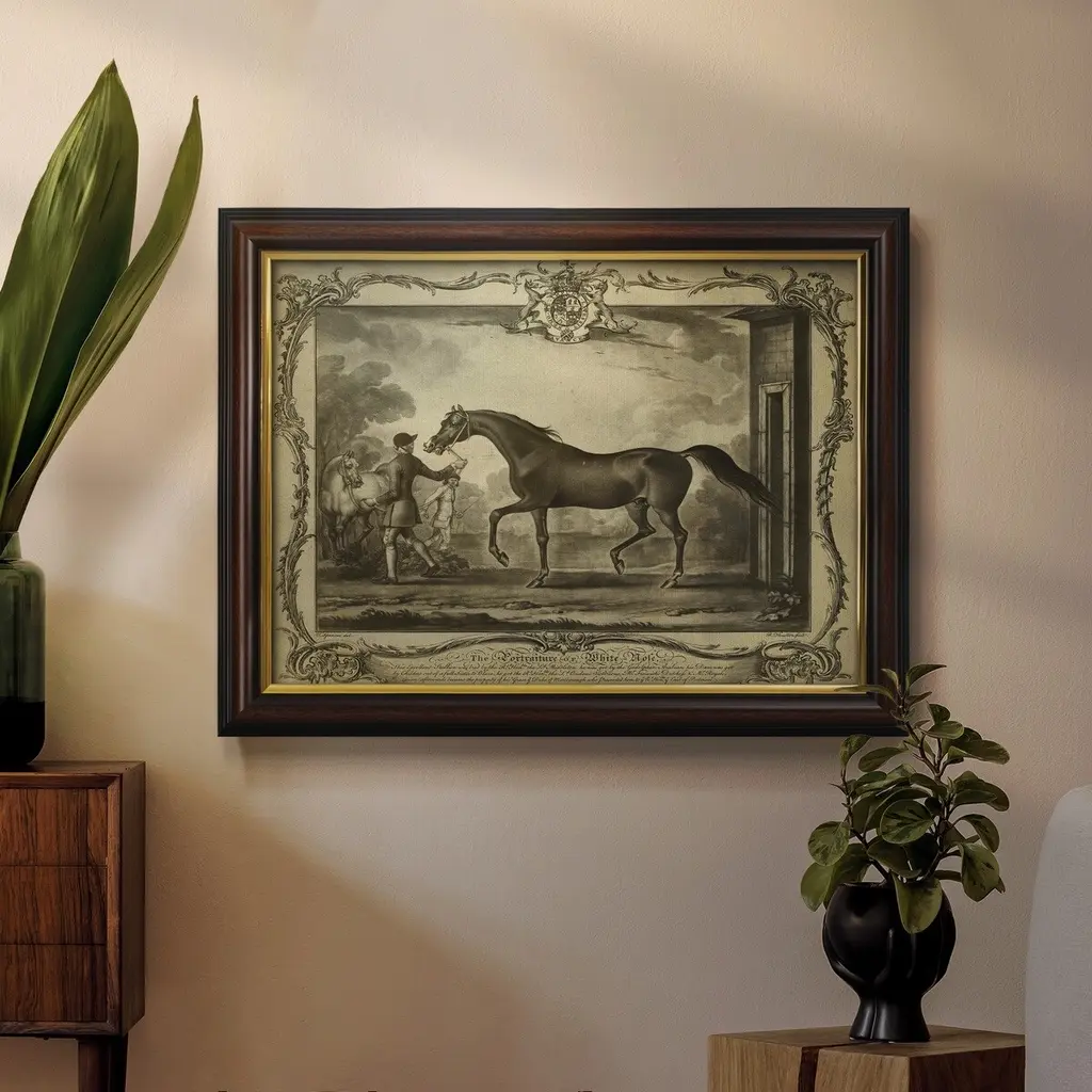 Distinguished Horses IV Premium Framed Canvas- Ready to Hang A Premium Framed Canvas created to last. Framed in distressed wood and available in an array of sizes and colors Featuring a beveled a solid wood stretcher bar, each piece comes ready to hand 3 SIZES AVAILABLE 16''X20'' - Overall Size 18'X27'' - Overall Size 24''x36'' - Overall Size Each piece is made to order. Each piece comes with hanging hardware. Made in the USA Ready to Hang Giclee Paper Print Acrylic Glass Beveled Matt Board