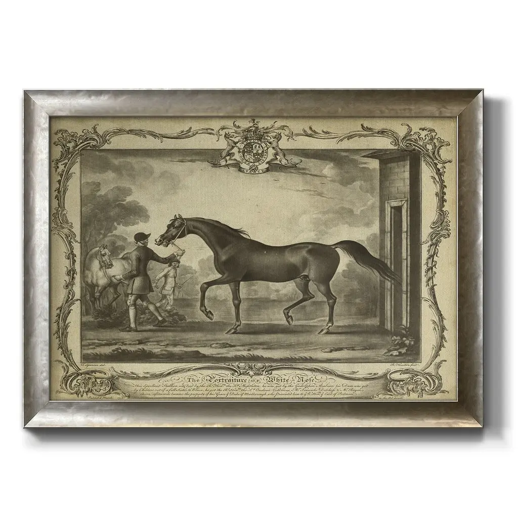 Distinguished Horses IV Premium Framed Canvas- Ready to Hang A Premium Framed Canvas created to last. Framed in distressed wood and available in an array of sizes and colors Featuring a beveled a solid wood stretcher bar, each piece comes ready to hand 3 SIZES AVAILABLE 16''X20'' - Overall Size 18'X27'' - Overall Size 24''x36'' - Overall Size Each piece is made to order. Each piece comes with hanging hardware. Made in the USA Ready to Hang Giclee Paper Print Acrylic Glass Beveled Matt Board
