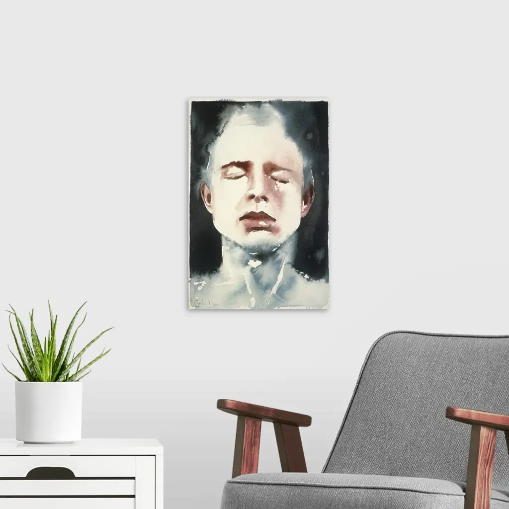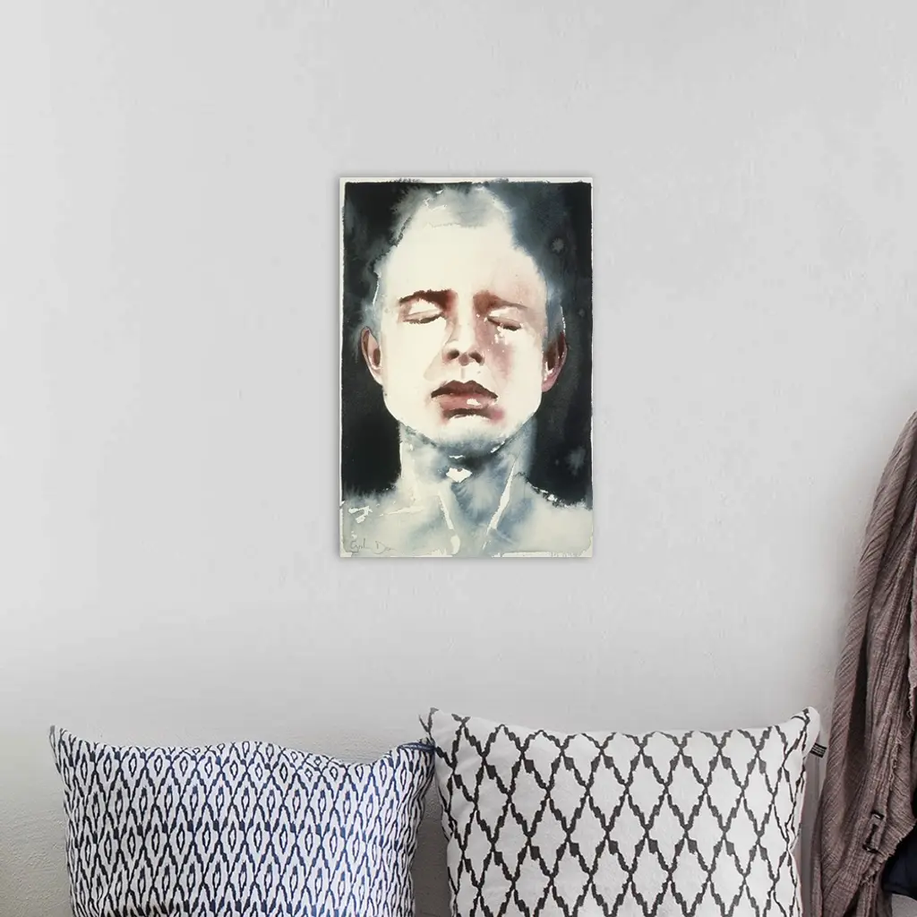 Contemporary watercolor painting of a person with closed eyes is partially submerged in dark water.