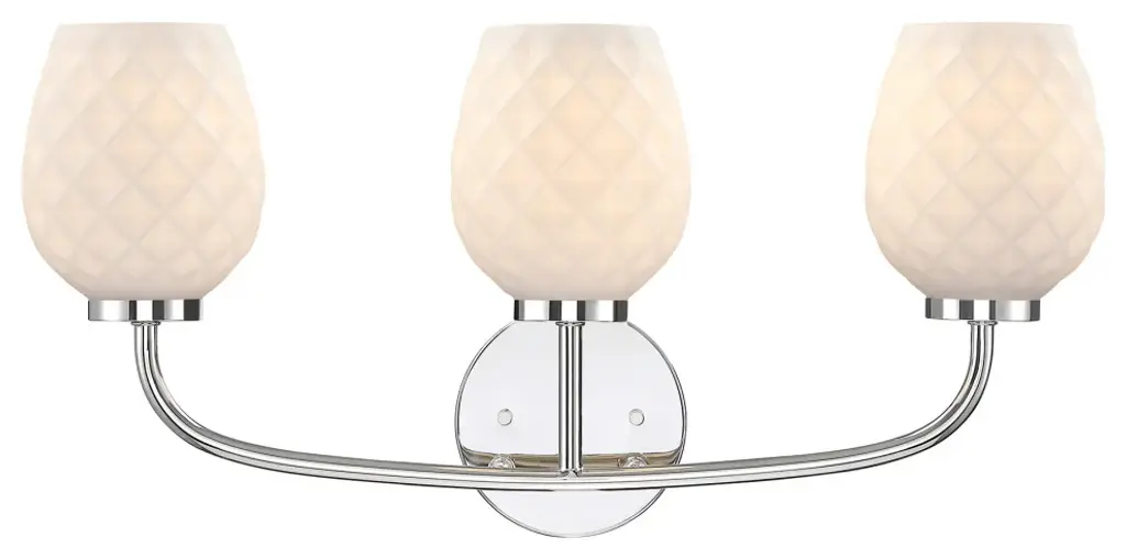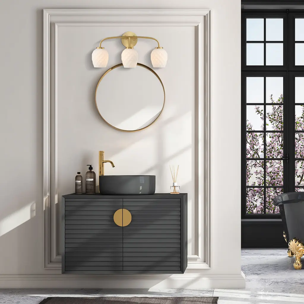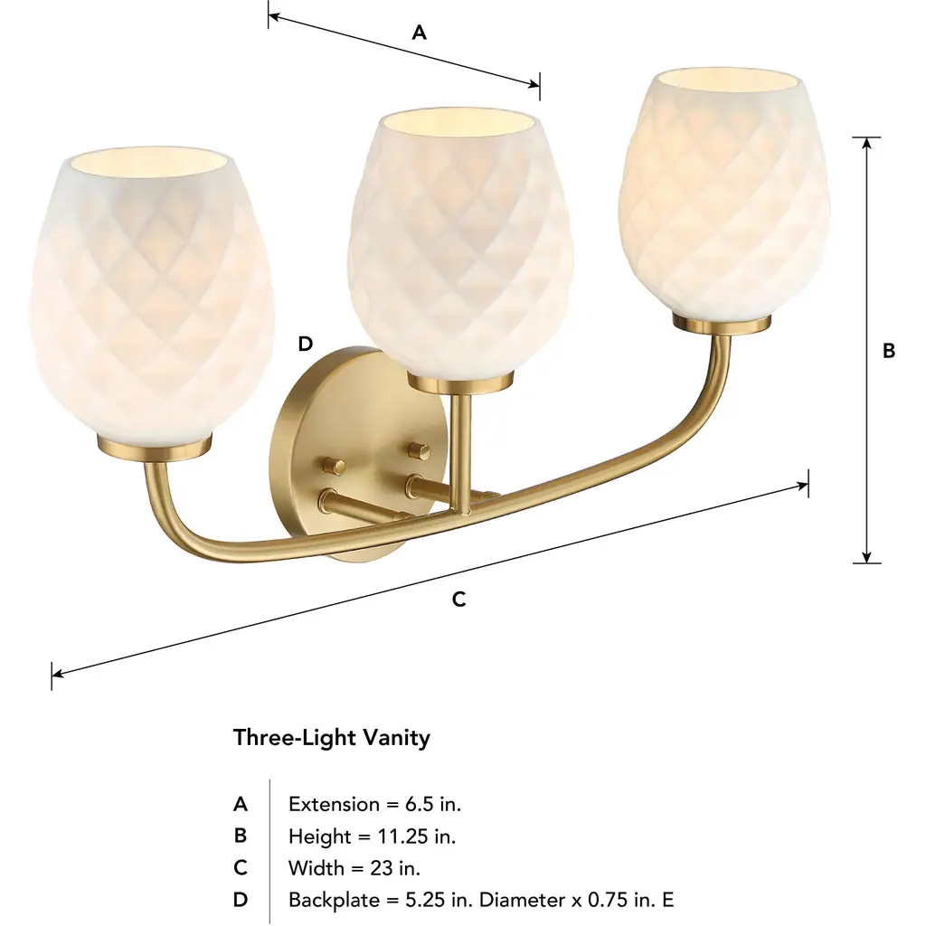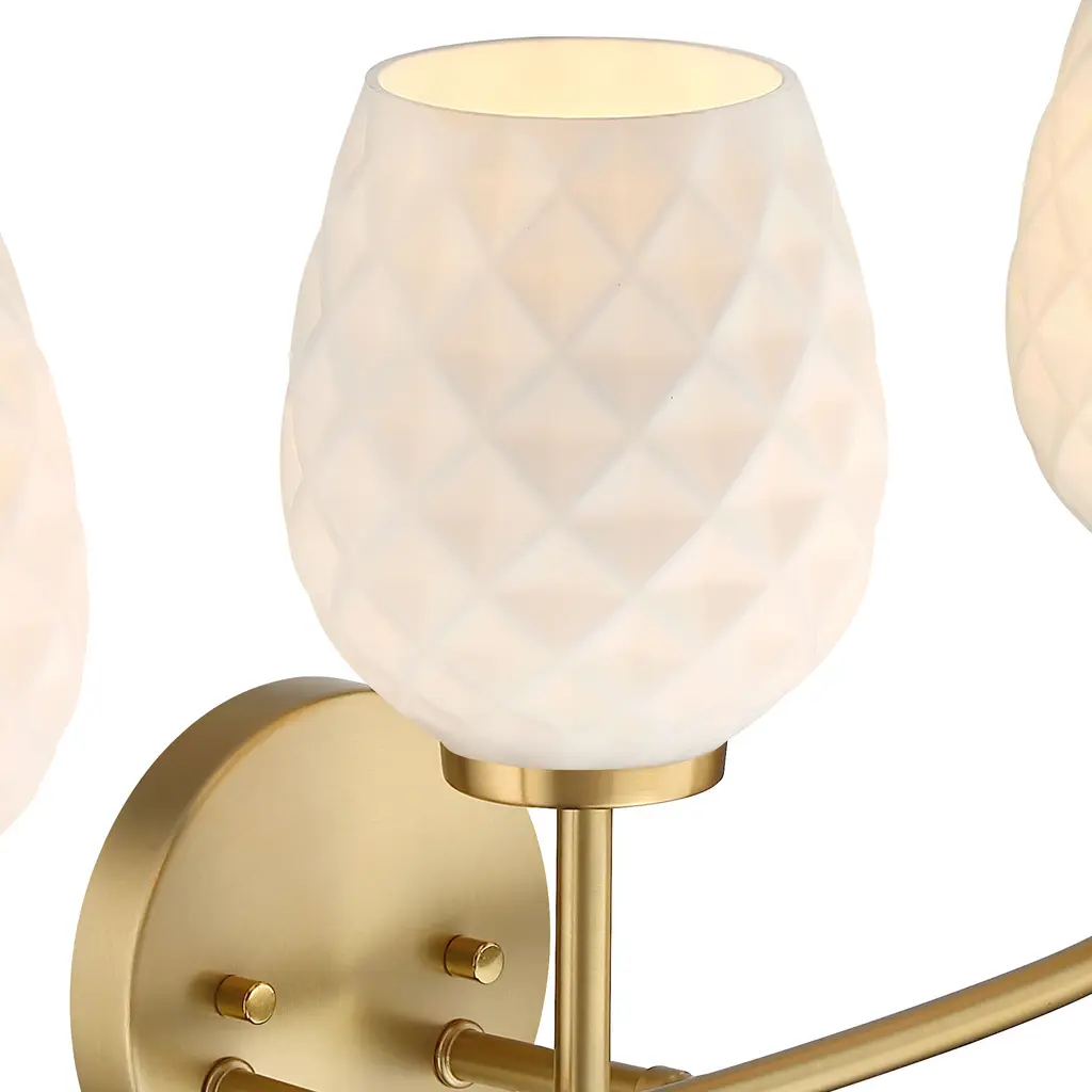 The geometric etched opal glass shades of the Dita family evoke the visual of a sculpted pineapple. The brushed gold finish of this vanity provides a classic look in bathrooms and bedrooms. Though Dita is especially complimentary to coastal or tropical-themed decors, its flexible enough to work with just about any interior design theme.