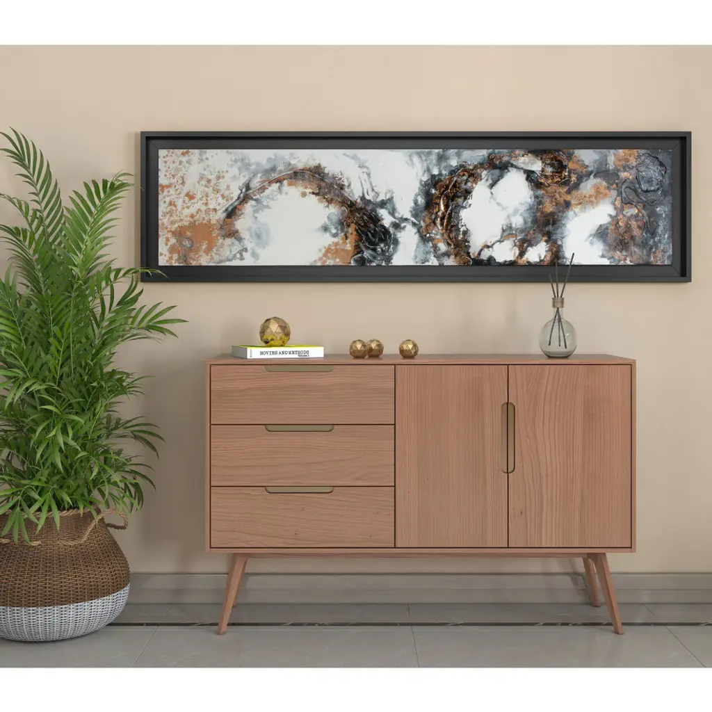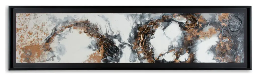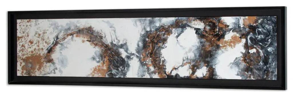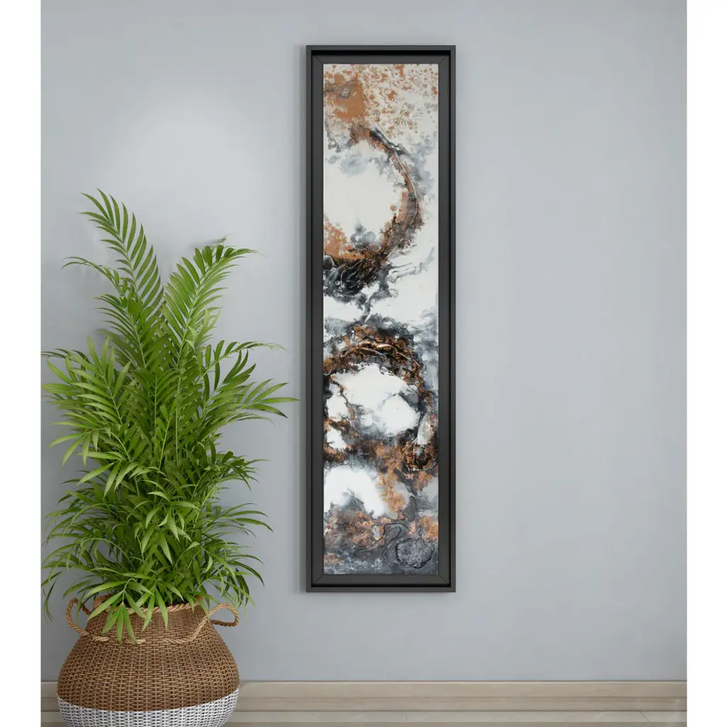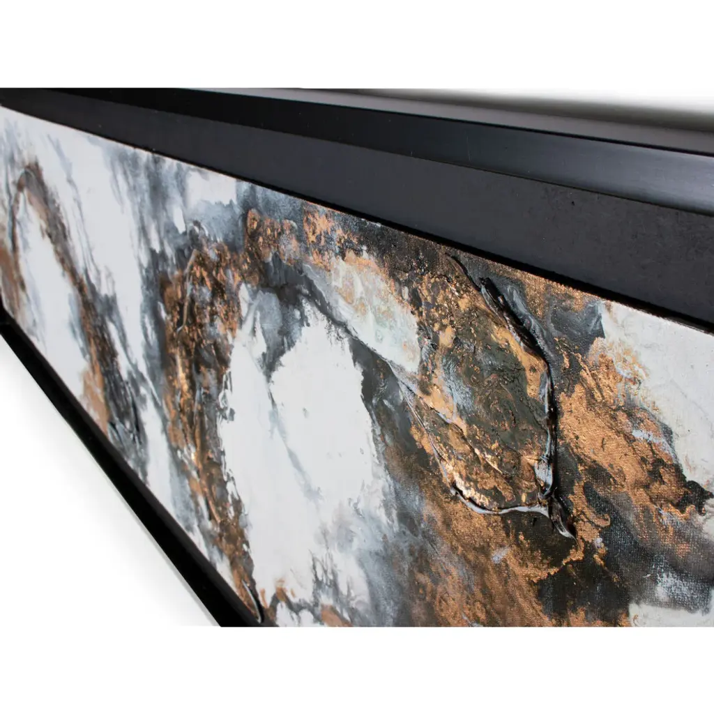 Make an artistic statement with this unique abstract featuring contrasting dark and bright shades. Finished with a black frame, this hand painted artwork adds a flair of sophistication to any design space.