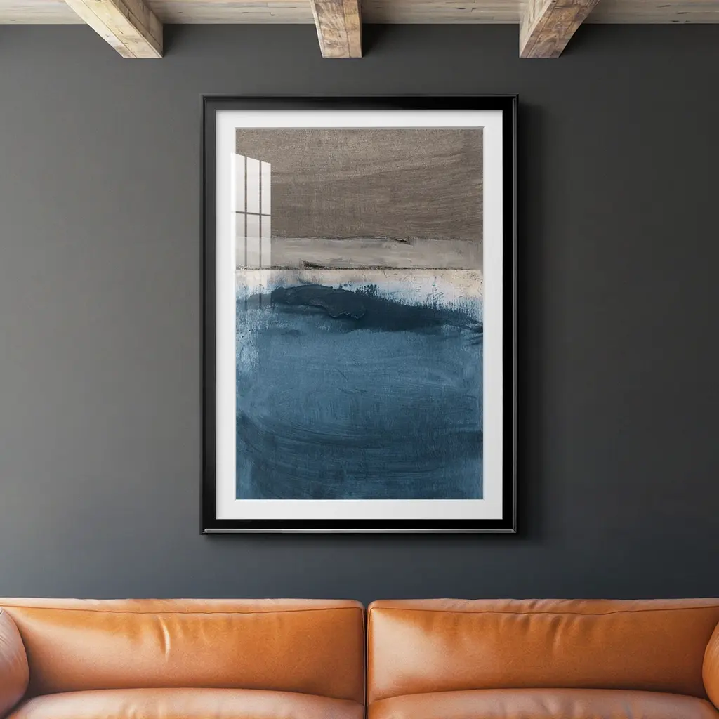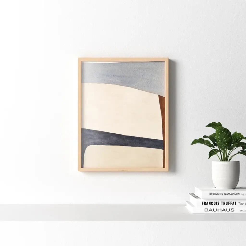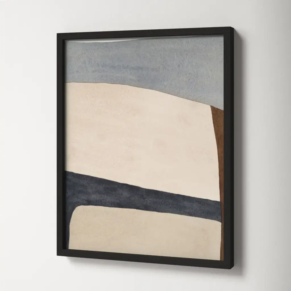 This watercolor painting print leans on abstract art movements like color field painting to create a bold abstract design. Printed in the USA, this piece by artist Julia Balfour features muted palette with tones of beige and brown interrupted by streaks of contrasting blue and gray. It's printed on fine art paper with a plexiglass cover for an accurate reproduction that lasts. Arrives framed and matted with includes wall mounting hardware, so it's ready to hang right out of the box.