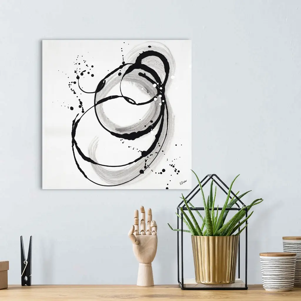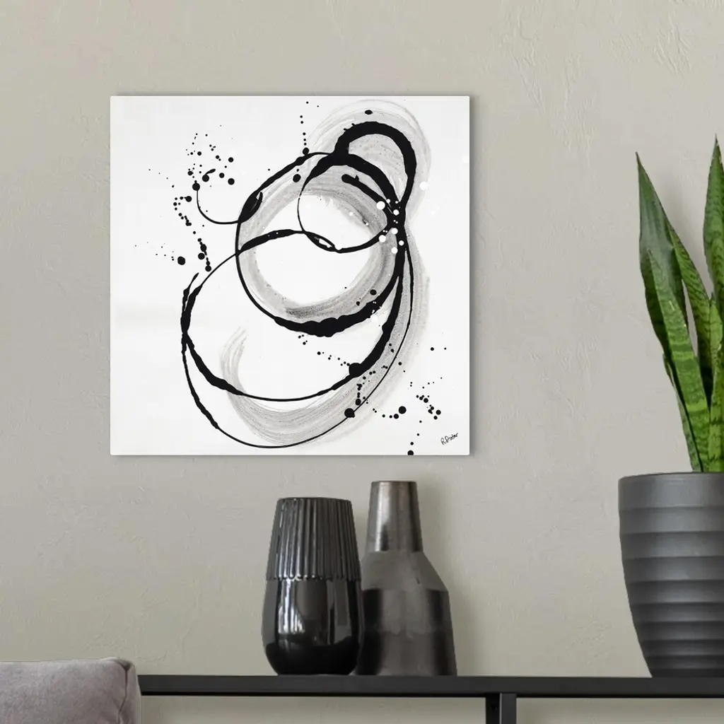 Abstract painting using dark black drip patterns in a circular motion, with light gray undertones. Giving the appearance of depth.