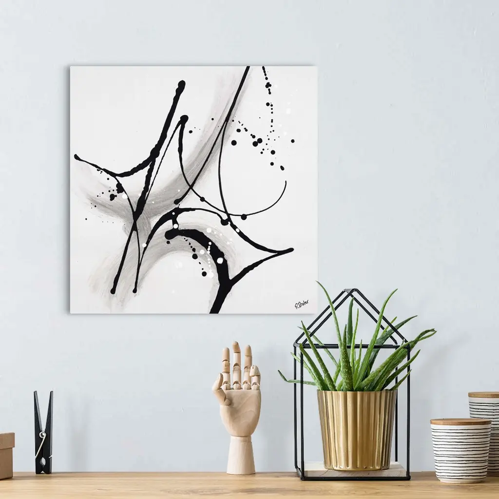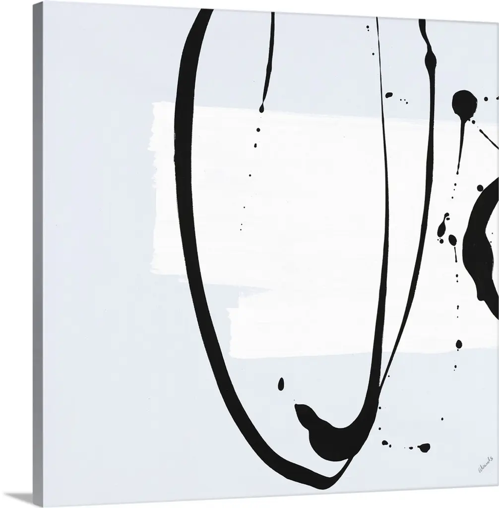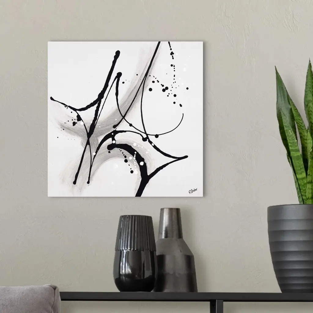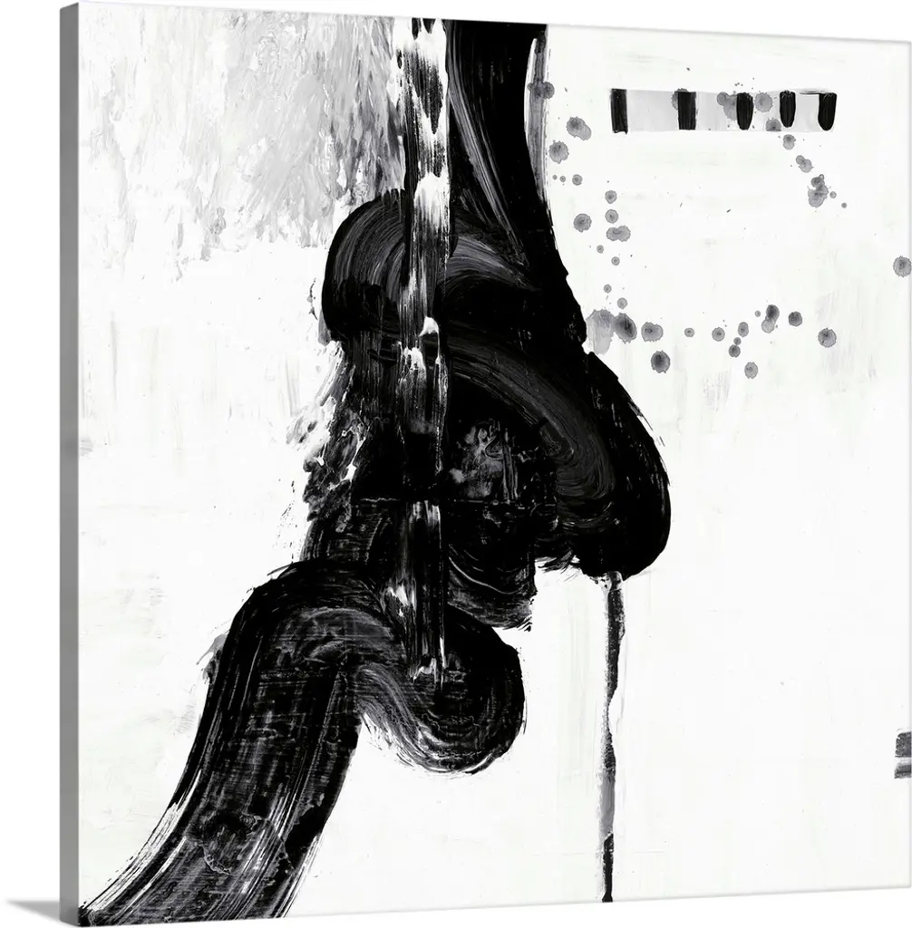 Abstract painting using dark black drip patterns in straight line striking motions with sharp curves, with light gray undertones. Giving the appearance of depth.