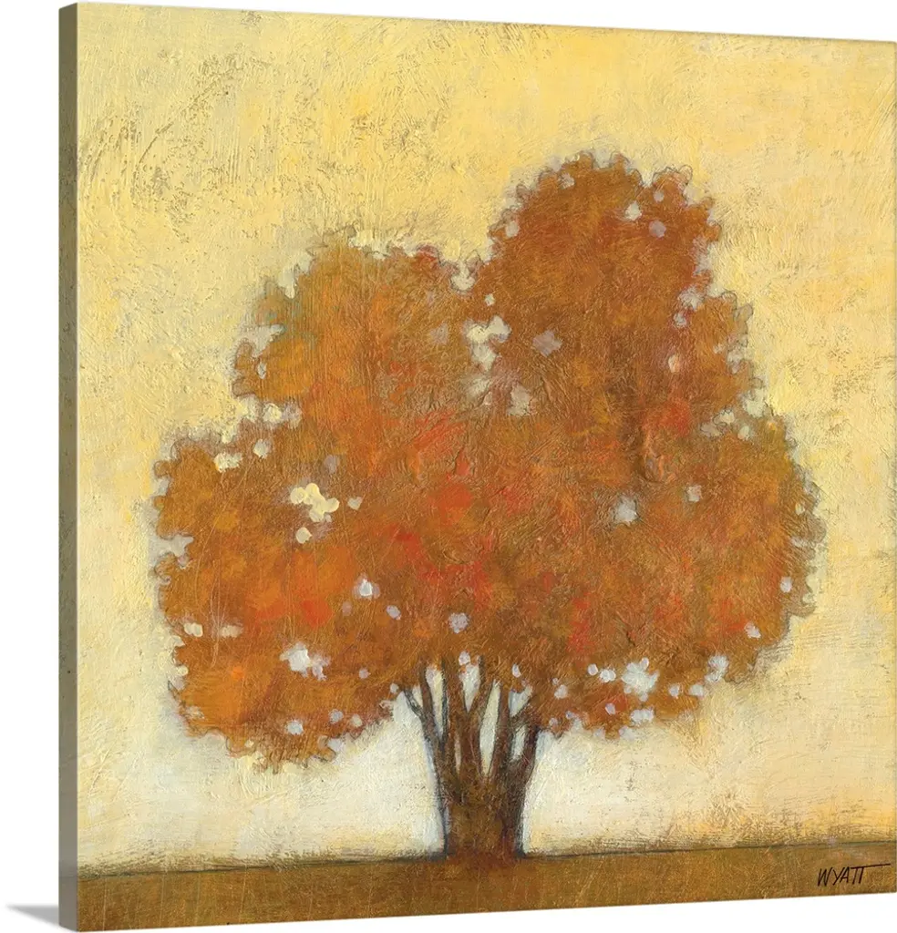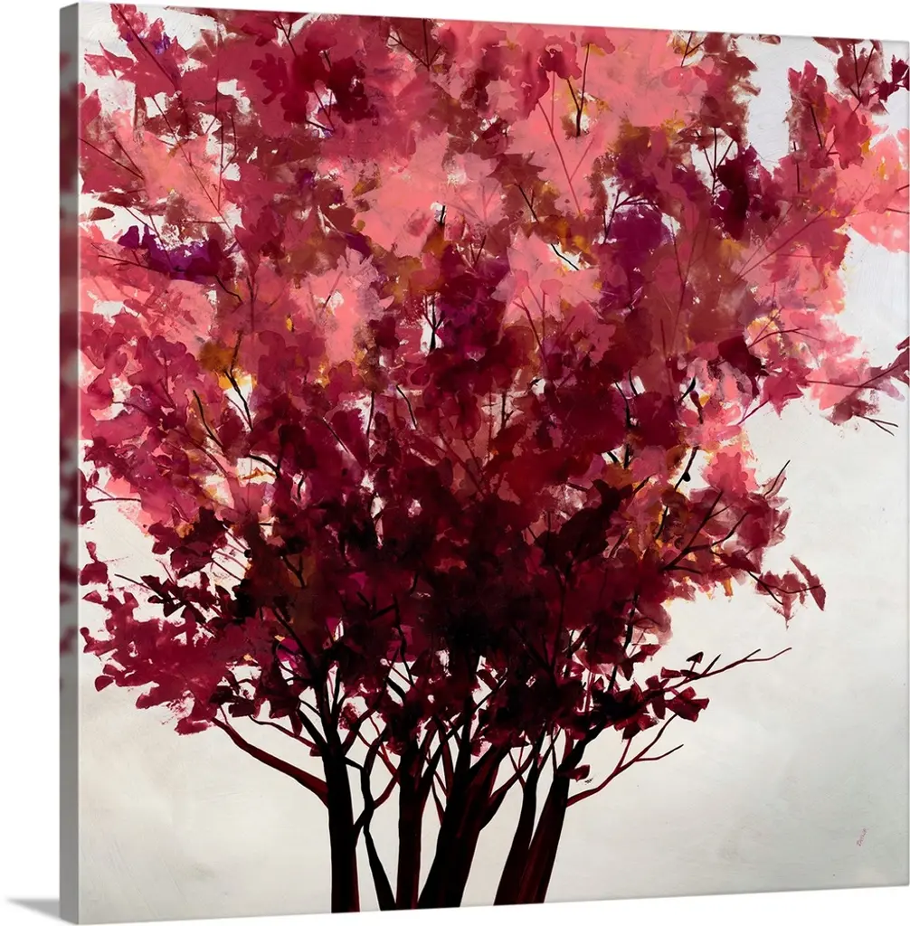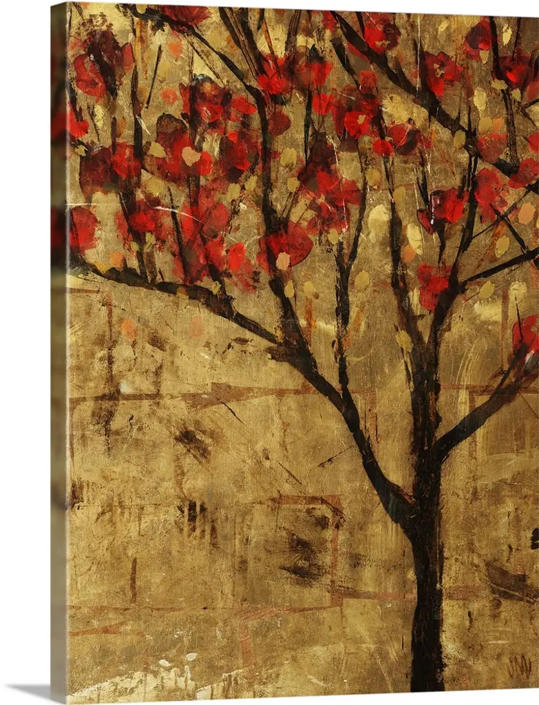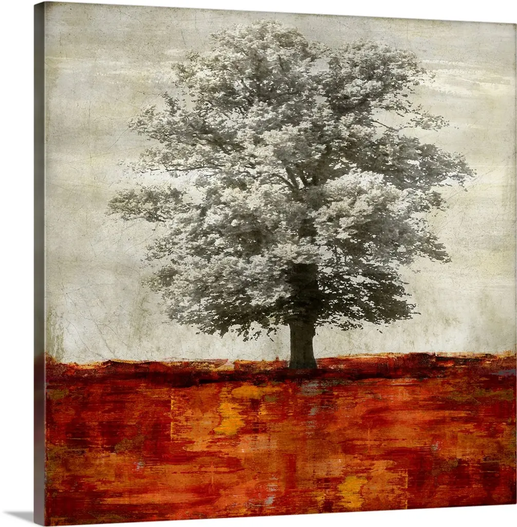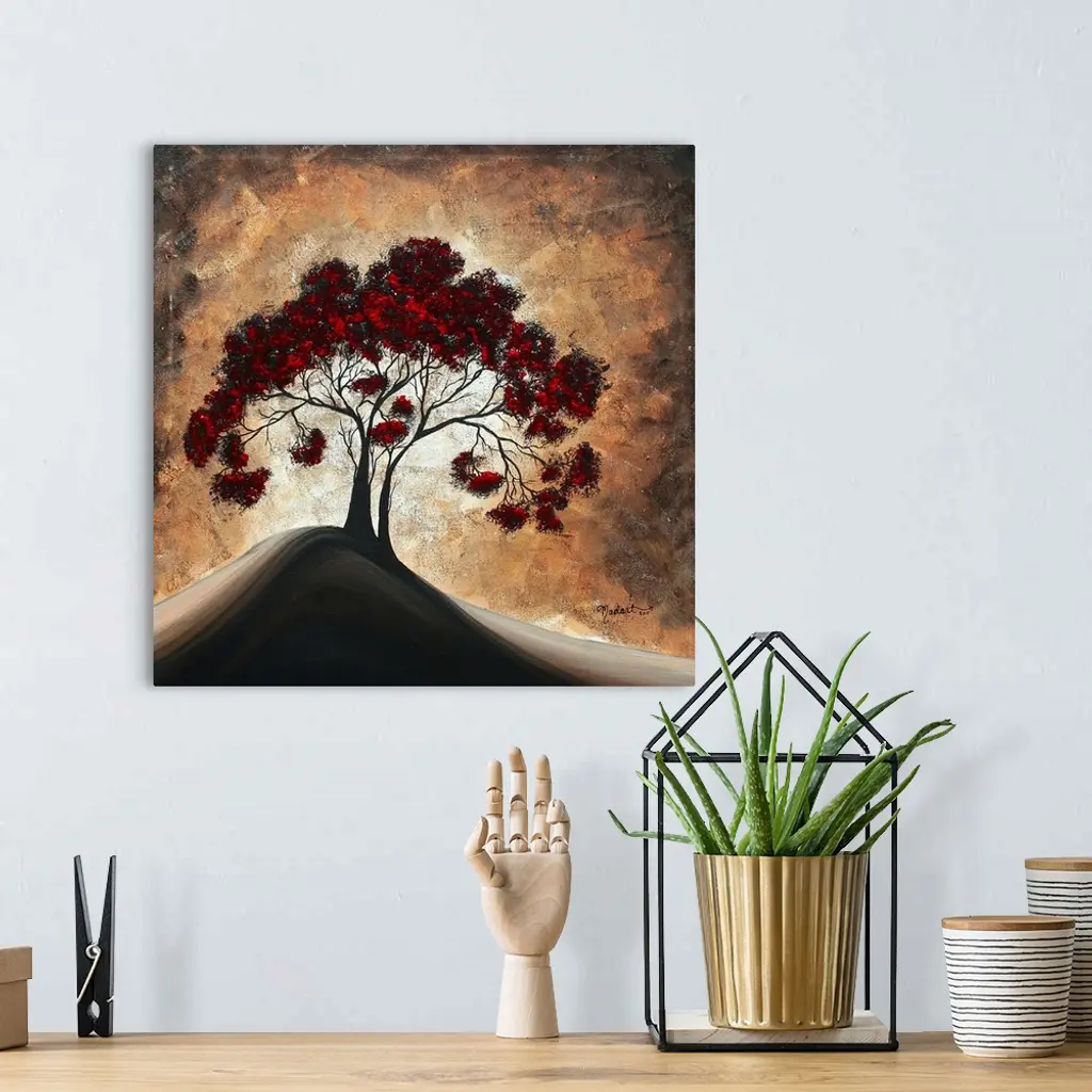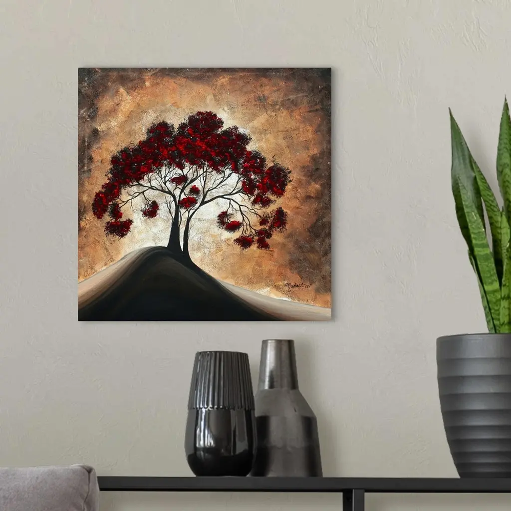 Contemporary painting of a tree with many branches and bright red leaves on a single hill with a heavily textured background.