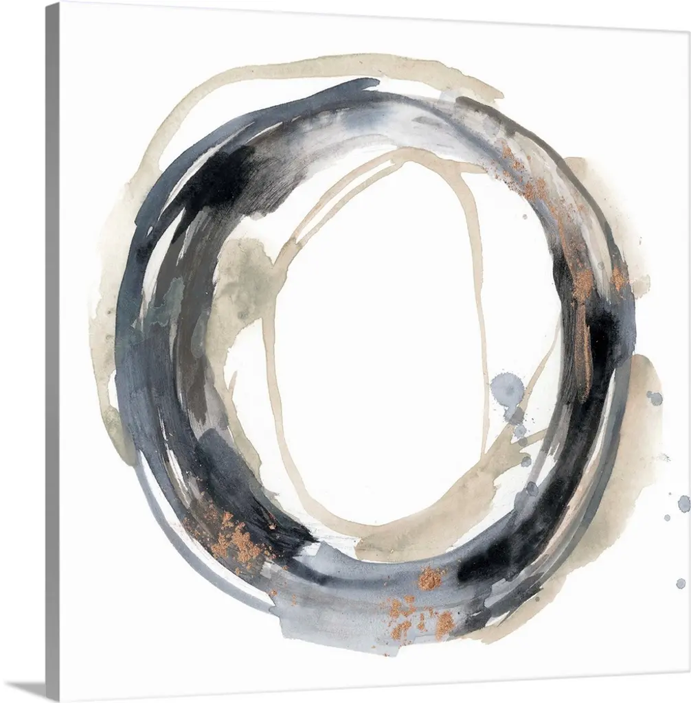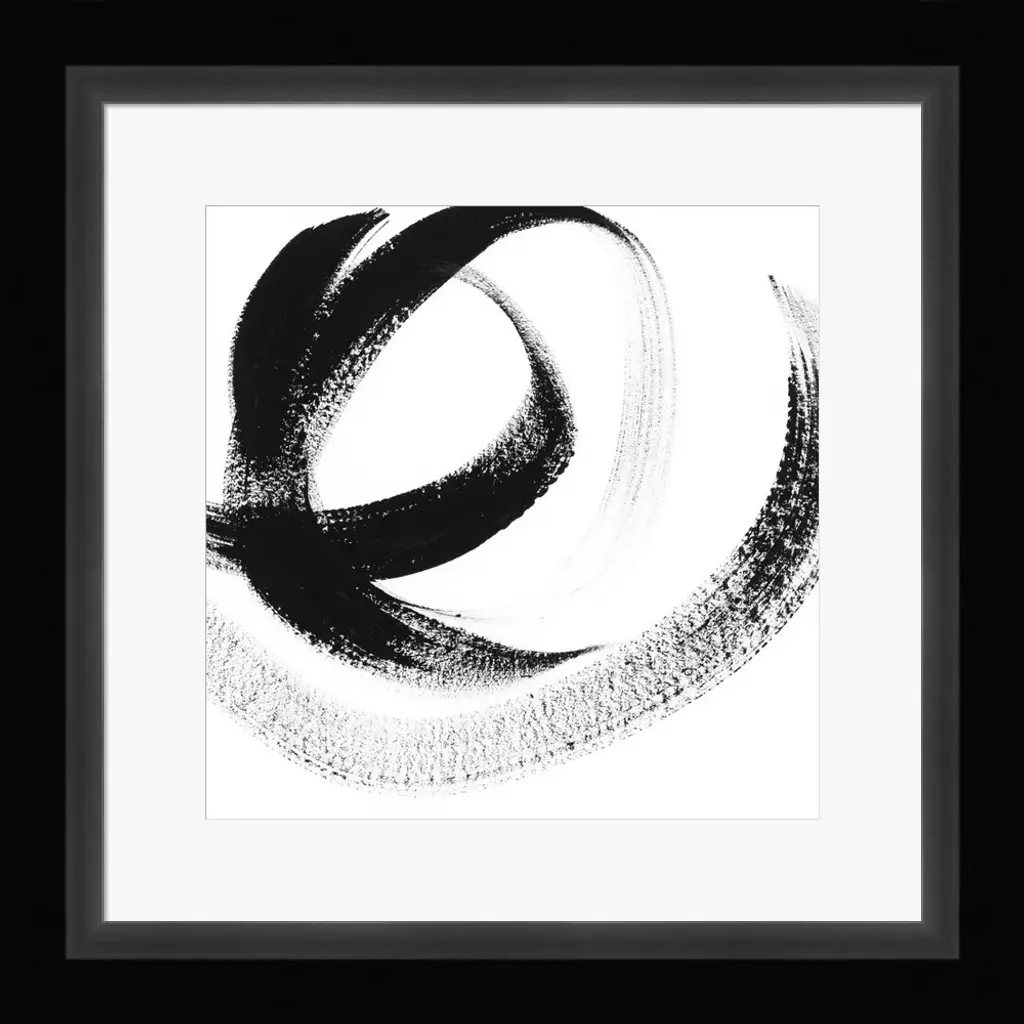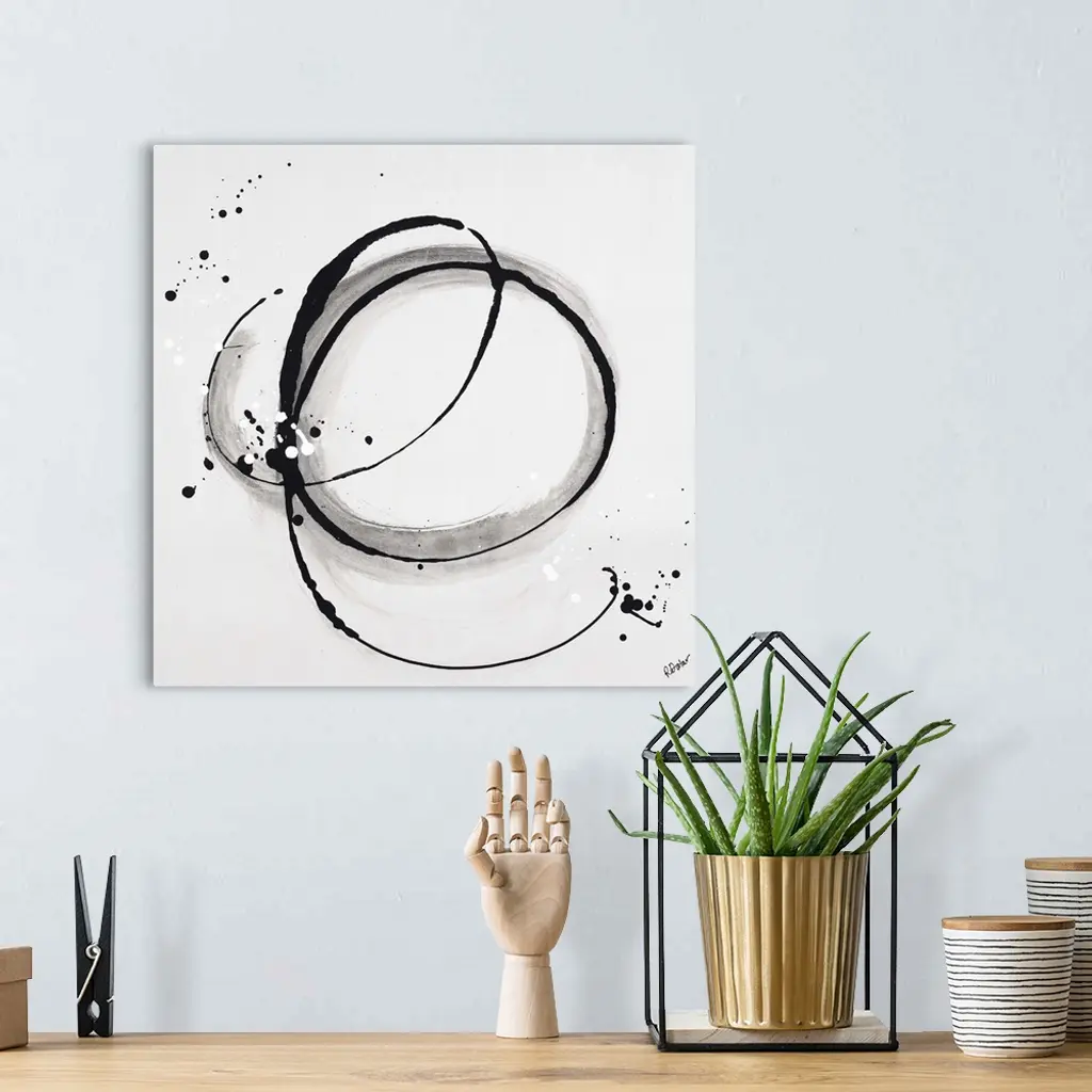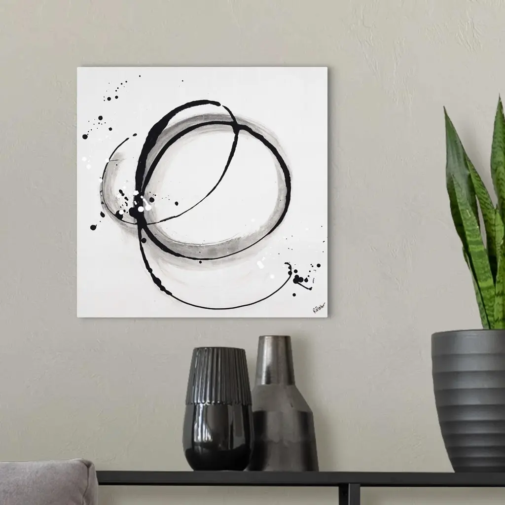 Abstract painting using dark black drip patterns in a circular motion, with light gray undertones. Giving the appearance of depth.
