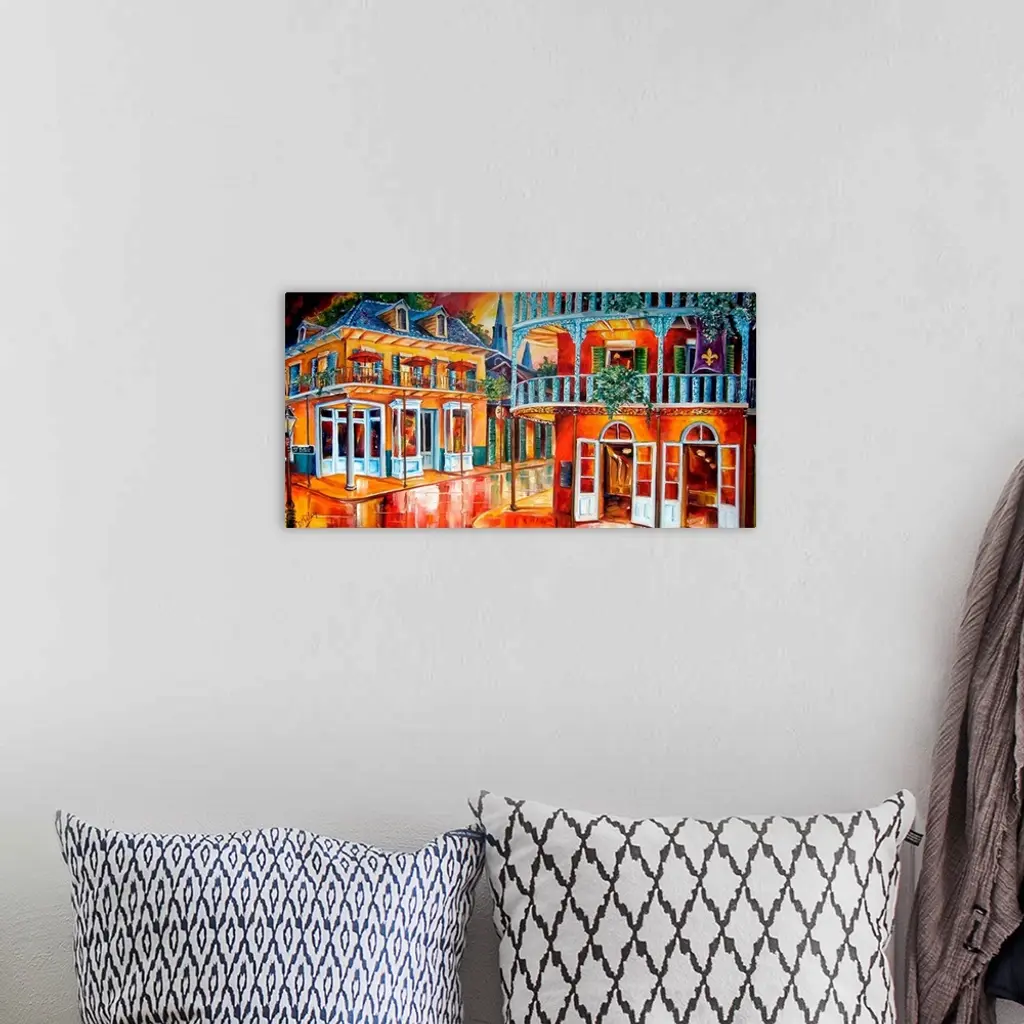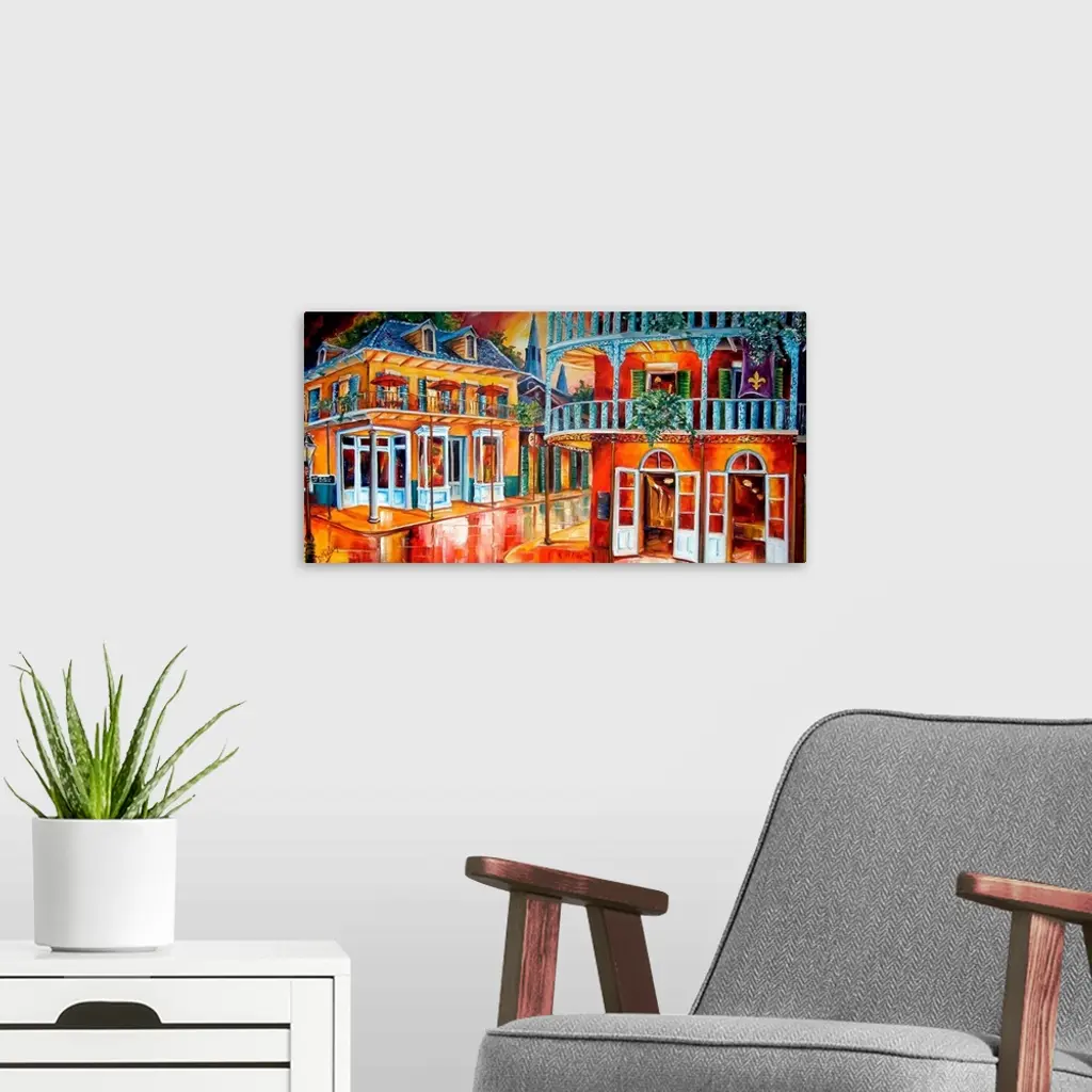 Oversized landscape painting of a city street intersection in New Orleans. Two large, historic buildings, each on a street corner, lit up at night.