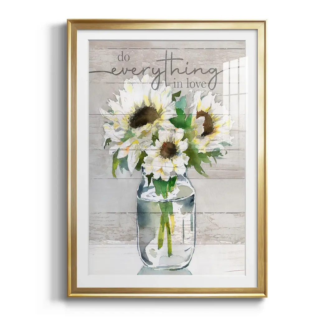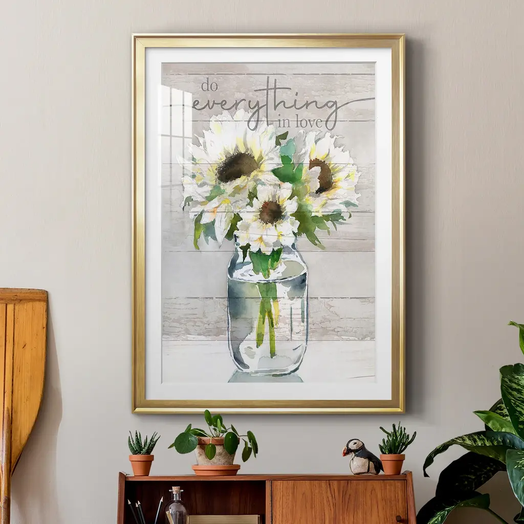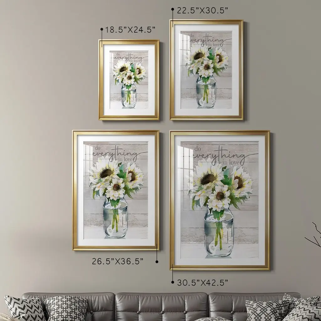 Do Everything In Love Premium Framed Print - Ready to Hang A Premium Framed Print created to last. Framed in distressed wood and available in an array of sizes and colors Featuring a beveled a solid wood stretcher bar, each piece comes ready to hand 4 SIZES AVAILABLE 30.5''X42.5'' - Overall Size 26.5'X36.5'' - Overall Size 22.5''x30.5'' - Overall Size 18.5''x24.5'' - Overall Size Each piece is made to order. Each piece comes with hanging hardware. Made in the USA Ready to Hang Giclee Paper Print Acrylic Glass Beveled Matt Board