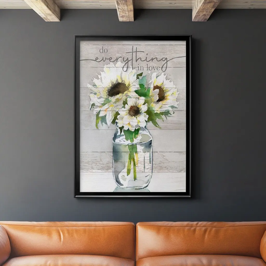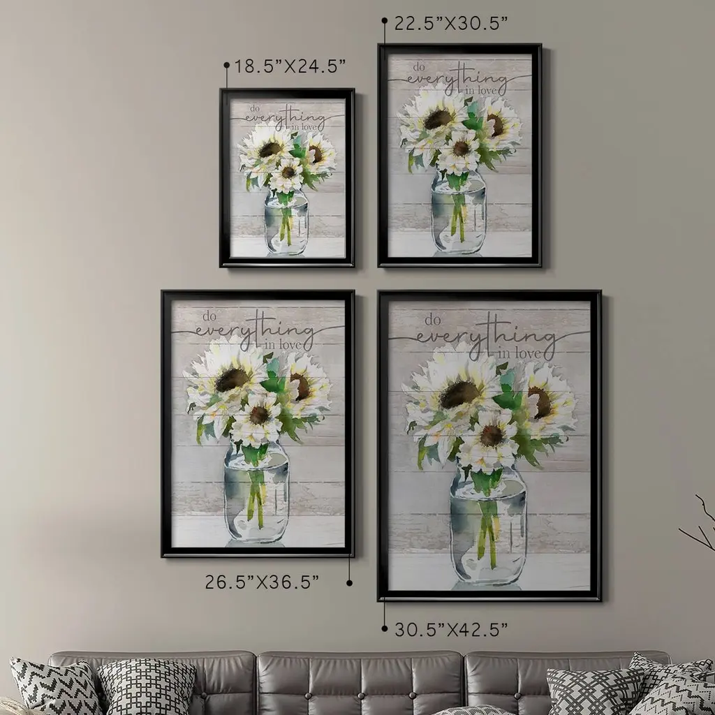 Do Everything In Love Premium Framed Print - Ready to Hang A Premium Framed Print created to last. Framed in distressed wood and available in an array of sizes and colors Featuring a beveled a solid wood stretcher bar, each piece comes ready to hand 4 SIZES AVAILABLE 30.5''X42.5'' - Overall Size 26.5'X36.5'' - Overall Size 22.5''x30.5'' - Overall Size 18.5''x24.5'' - Overall Size Each piece is made to order. Each piece comes with hanging hardware. Made in the USA Ready to Hang